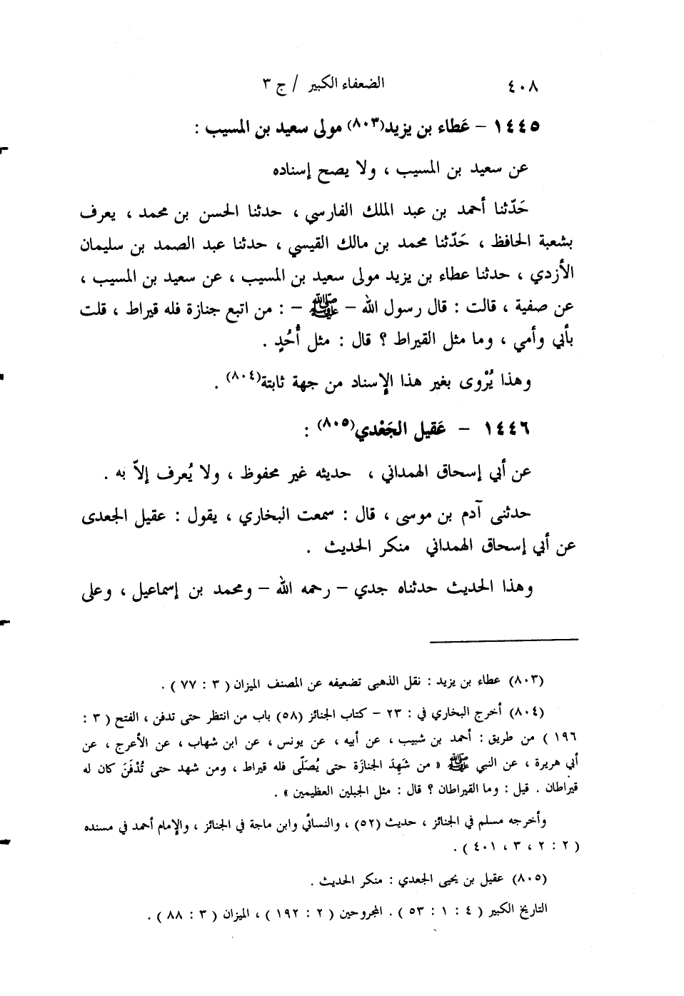 §1446 - عَقِيلٌ الْجَعْدِيُّ عَنْ أَبِي إِسْحَاقَ الْهَمْدَانِيِّ، حَدِيثُهُ غَيْرُ مَحْفُوظٍ، وَلَا يُعْرَفُ إِلَّا بِهِ. حَدَّثَنِي آدَمُ بْنُ مُوسَى قَالَ: سَمِعْتُ الْبُخَارِيَّ يَقُولُ: عَقِيلٌ الْجَعْدِيُّ، عَنْ أَبِي إِسْحَاقَ الْهَمْدَانِيِّ، مُنْكَرُ الْحَدِيثِ