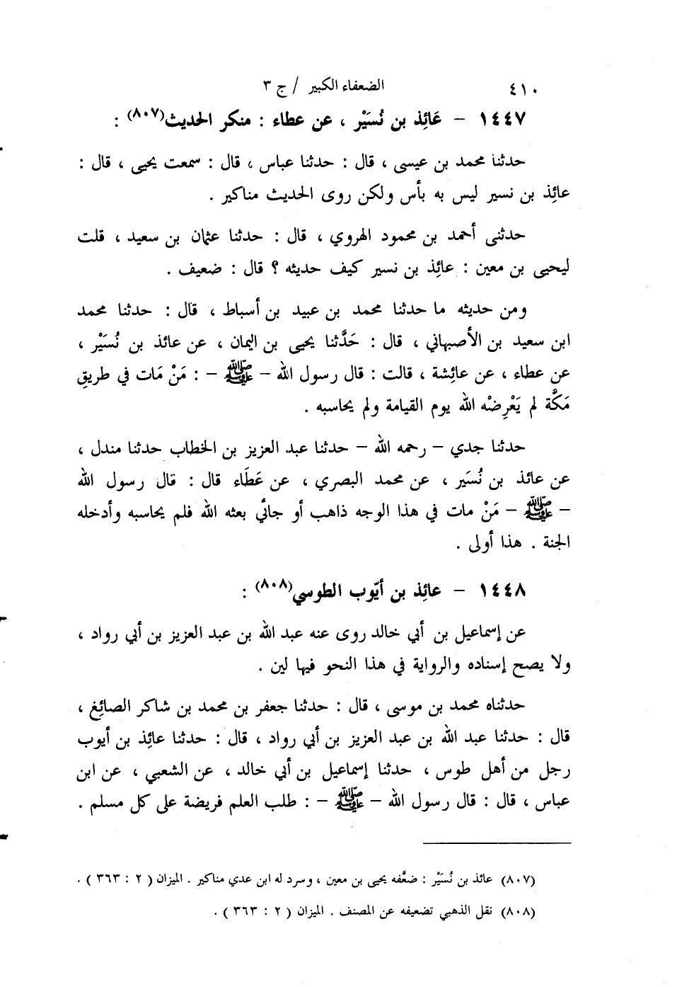 §1447 - عَائِذُ بْنُ نُسَيْرٍ عَنْ عَطَاءٍ: مُنْكَرُ الْحَدِيثِ. حَدَّثَنَا مُحَمَّدُ بْنُ عِيسَى قَالَ: حَدَّثَنَا عَبَّاسٌ قَالَ: سَمِعْتُ يَحْيَى قَالَ: عَائِذُ بْنُ نُسَيْرٍ لَيْسَ بِهِ بَأْسٌ، وَلَكِنْ رَوَى أَحَادِيثَ مَنَاكِيرَ. حَدَّثَنِي أَحْمَدُ بْنُ مَحْمُودٍ الْهَرَوِيُّ قَالَ: حَدَّثَنَا عُثْمَانُ بْنُ سَعِيدٍ، قُلْتُ لِيَحْيَى بْنِ مَعِينٍ: عَائِذُ بْنُ نُسَيْرٍ كَيْفَ حَدِيثُهُ؟ قَالَ: ضَعِيفٌ