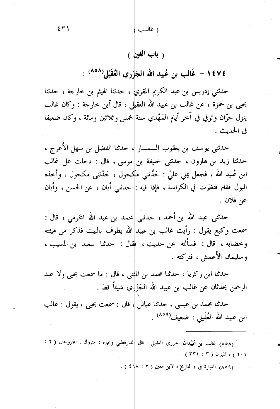 §1474 - غَالِبُ بْنُ عُبَيْدِ اللَّهِ الْجَزَرِيُّ الْعُقَيْلِيُّ حَدَّثَنِي إِدْرِيسُ بْنُ عَبْدِ الْكَرِيمِ الْمُقْرِئُ، حَدَّثَنَا الْهَيْثَمُ بْنُ خَارِجَةَ، حَدَّثَنَا يَحْيَى بْنُ حَمْزَةَ، عَنْ غَالِبِ بْنِ عُبَيْدِ اللَّهِ الْعُقَيْلِيِّ، قَالَ ابْنُ خَارِجَةَ: وَكَانَ غَالِبٌ يَنْزِلُ حَرَّانَ وَتُوُفِّيَ فِي آخِرِ أَيَّامِ الْمَهْدِيِّ سَنَةَ خَمْسٍ وَثَلَاثِينَ وَمِائَةٍ، وَكَانَ ضَعِيفًا فِي الْحَدِيثِ حَدَّثَنِي يُوسُفُ بْنُ يَعْقُوبَ السِّمْسَارُ، حَدَّثَنَا الْفَضْلُ بْنُ سَهْلٍ الْأَعْرَجُ، حَدَّثَنَا زَيْدُ بْنُ هَارُونَ، حَدَّثَنِي خَلِيفَةُ بْنُ مُوسَى قَالَ: دَخَلْتُ عَلَى غَالِبِ بْنِ عُبَيْدِ اللَّهِ فَجَعَلَ يُمْلِي عَلَيَّ: حَدَّثَنِي مَكْحُولٌ، حَدَّثَنِي مَكْحُولٌ، وَأَخَذَهُ الْبَوْلُ، فَقَامَ، فَنَظَرْتُ فِي الْكُرَّاسَةِ فَإِذَا فِيهِ: حَدَّثَنِي أَبَانُ، عَنِ الْحَسَنِ، وَأَبَانُ، عَنْ فُلَانٍ حَدَّثَنِي عَبْدُ اللَّهِ بْنُ أَحْمَدَ، حَدَّثَنِي مُحَمَّدُ بْنُ عَبْدِ اللَّهِ الْمُخَرِّمِيُّ قَالَ: سَمِعْتُ وَكِيعًا يَقُولُ: رَأَيْتُ غَالِبَ بْنَ عُبَيْدِ اللَّهِ يَطُوفُ بِالْبَيْتِ، فَذَكَرَ مِنْ هَيْئَتِهِ وَخِضَابِهِ، قَالَ: فَسَأَلْتُهُ عَنْ حَدِيثٍ فَقَالَ: حَدَّثَنَا سَعِيدُ بْنُ الْمُسَيِّبِ وَسُلَيْمَانُ الْأَعْمَشُ فَتَرَكْتُهُ حَدَّثَنَا ابْنُ زَكَرِيَّا، حَدَّثَنَا مُحَمَّدُ بْنُ الْمُثَنَّى قَالَ: مَا سَمِعْتُ يَحْيَى، وَلَا عَبْدَ الرَّحْمَنِ يُحَدِّثَانِ عَنْ غَالِبِ بْنِ عُبَيْدِ اللَّهِ الْجَزَرِيِّ، شَيْئًا قَطُّ حَدَّثَنَا مُحَمَّدُ بْنُ عِيسَى، حَدَّثَنَا عَبَّاسٌ قَالَ: سَمِعْتُ يَحْيَى يَقُولُ: غَالِبُ بْنُ عُبَيْدِ اللَّهِ الْعُقَيْلِيُّ ضَعِيفٌ حَدَّثَنِي آدَمُ قَالَ: سَمِعْتُ الْبُخَارِيَّ قَالَ: غَالِبُ بْنُ عُبَيْدِ اللَّهِ مُنْكَرُ الْحَدِيثِ