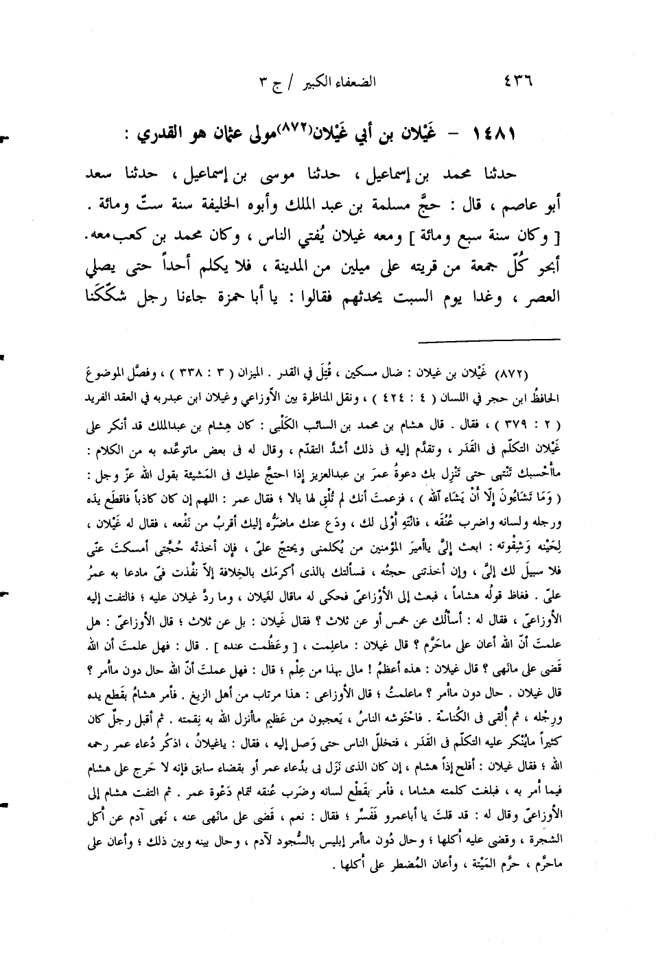 §1481 - غَيْلَانُ بْنُ أَبِي غَيْلَانَ مَوْلَى عُثْمَانَ هُوَ الْقَدَرِيُّ. حَدَّثَنَا مُحَمَّدُ بْنُ إِسْمَاعِيلَ، حَدَّثَنَا مُوسَى بْنُ إِسْمَاعِيلَ، حَدَّثَنَا سَعْدٌ أَبُو عَاصِمٍ قَالَ: حَجَّ مَسْلَمَةُ بْنُ عَبْدِ الْمَلِكِ وَأَبُوهُ الْخَلِيفَةُ سَنَةَ سِتٍّ وَمِائَةٍ، وَكَانَ سَنَةَ سَبْعٍ وَمِائَةٍ وَمَعَهُ غَيْلَانُ يُفْتِي النَّاسَ، وَكَانَ مُحَمَّدُ بْنُ كَعْبٍ مَعَهُ. أَبْحَرَ كُلَّ جُمُعَةٍ مِنْ قَرْيَتِهِ عَلَى مِيلَيْنِ مِنَ الْمَدِينَةِ، فَلَا يُكَلِّمُ أَحَدًا حَتَّى يُصَلِّيَ الْعَصْرَ، وَغَدَا يَوْمَ السَّبْتِ يُحَدِّثُهُمْ فَقَالُوا: يَا أَبَا حَمْزَةَ، جَاءَنَا رَجُلٌ شَكَّكَنَا -[437]- فِي دِينِنَا، قَالَ: فَأْتُونِي بِهِ إِنْ شِئْتُمْ، فَقَالَ: أَتَى إِلَيْهِ غَيْلَانُ فَقَالَ: السَّلَامُ عَلَيْكَ يَا أَبَا حَمْزَةَ قَالَ: وَعَلَيْكَ يَا أَبَا مَرْوَانَ، فَقَالَ مُحَمَّدٌ: قَالَ: لَا يَكُونُ كَلَامٌ حَتَّى تَشْهَدَ قَبْلُ، قَالَ غَيْلَانُ: ابْدَأْ، قَالَ: أَشْهَدُ أَنْ لَا إِلَهَ إِلَّا اللَّهُ وَأَنَّ مُحَمَّدًا عَبْدُهُ وَرَسُولُهُ أَرْسَلَهُ بِالْهُدَى وَدِينِ الْحَقِّ لِيُظْهِرَهُ عَلَى الدِّينِ كُلِّهِ وَلَوْ كَرِهَ الْمُشْرِكُونَ، مِنْ يَهْدِهِ اللَّهُ فَلَا مُضِلَّ لَهُ، وَمَنْ يُضْلِلْ فَلَا هَادِيَ لَهُ، قَالَ: تَشْهَدُ أَنَّهُ حَقٌّ مِنْ قَلْبِكَ؟ قَالَ: حَسْبِي، قَالَ: إِنَّ الْقُرْآنَ يَنْسَخُ بَعْضُهُ بَعْضًا، قَالَ: لَا حَاجَةَ لِي فِي كَلَامِكَ، إِمَّا أَنْ تَقُومَ عَنِّي وَإِمَّا أَنْ أَقُومَ عَنْكَ. حَدَّثَنَا عَبْدُ اللَّهِ بْنُ أَحْمَدَ، حَدَّثَنِي سَوَّارُ بْنُ عَبْدِ اللَّهِ، حَدَّثَنَا مُعَاذُ بْنُ مُعَاذٍ، عَنِ ابْنِ عَوْنٍ قَالَ: مَرَرْتُ بِغَيْلَانَ فَإِذَا هُوَ مَصْلُوبٌ عَلَى بَابِ الشَّامِ. حَدَّثَنَا مُوسَى بْنُ عَلِيٍّ الْخُتُلِّيُّ، حَدَّثَنَا الْحَسَنُ بْنُ عَبْدِ الْعَزِيزِ الْحَمَوِيُّ، حَدَّثَنَا أَبُو مُسْهِرٍ، حَدَّثَنَا عَوْنُ بْنُ حَكِيمٍ، حَدَّثَنِي الْوَلِيدُ بْنُ السَّائِبِ، أَنَّ رَجَاءَ بْنَ حَيْوَةَ، كَتَبَ إِلَى هِشَامِ بْنِ عَبْدِ الْمَلِكِ: بَلَغَنِي يَا أَمِيرَ الْمُؤْمِنِينَ أَنَّهُ دَخَلَ عَلَيْكَ شَيْءٌ مِنْ قَتْلِ غَيْلَانَ وَصَالِحٍ، وَأُقْسِمُ لَكَ يَا أَمِيرَ الْمُؤْمِنِينَ أَنَّ قَتْلَهُمَا أَفْضَلُ مِنْ قَتْلِ أَلْفَيْنِ مِنَ الرُّومِ وَالتُّرْكِ. حَدَّثَنَا أَحْمَدُ بْنُ دَاوُدَ، حَدَّثَنَا هِشَامُ بْنُ عَمَّارٍ، حَدَّثَنَا الْهَيْثَمُ بْنُ عِمْرَانَ، حَدَّثَنَا عُمَرُ بْنُ يَزِيدَ النَّضْرِيُّ قَالَ: كَتَبَ نُمَيْرُ بْنُ أَوْسٍ إِلَى هِشَامِ بْنِ عَبْدِ الْمَلِكِ: يَا أَمِيرَ الْمُؤْمِنِينَ، إِنَّ قَتْلَ غَيْلَانَ كَانَ مِنْ فُتُوحِ اللَّهِ الْعِظَامِ عَلَى هَذِهِ الْأُمَّةِ. حَدَّثَنَا عَبْدُ اللَّهِ بْنُ أَحْمَدَ، حَدَّثَنَا مَنْصُورُ بْنُ أَبِي مُزَاحِمٍ، حَدَّثَنَا أَبُو سَعِيدٍ مُحَمَّدُ بْنُ مُسْلِمِ بْنِ أَبِي الْوَضَّاحِ، عَنْ مُحَمَّدِ بْنِ عَبْدِ اللَّهِ الشُّعَيْثِيُّ، عَنْ مَكْحُولٍ قَالَ: أَتَاهُ رَجُلٌ فَقَالَ: يَا أَبَا عَبْدِ اللَّهِ، أَتَيْتُ صَدِيقًا لَكَ الْيَوْمَ أَعُودُهُ فَدَفَعَ فِي صَدْرِي دُونَهُ، فَقَالَ: مَنْ هُوَ؟ فَكَأَنَّهُ كَرِهَ أَنْ يُخْبِرَهُ، فَمَا زَالَ بِهِ حَتَّى قَالَ: هُوَ غَيْلَانُ قَالَ: غَيْلَانُ؟ قَالَ: نَعَمْ، قَالَ: إِنْ دَعَاكَ غَيْلَانُ فَلَا تُجِبْهُ، وَإِنْ مَرِضَ فَلَا تَعُدْهُ، وَإِنْ مَاتَ فَلَا تَتْبَعْ جَنَازَتَهُ. قَالَ عَبْدُ اللَّهِ بْنُ عُمَرَ وَذُكِرَ الْقَدَرُ فَقَالَ: وَقَدْ أَظْهَرُوهُ؟ قَالُوا: نَعَمْ، قَالَ: فَإِنِّي سَمِعْتُ رَسُولَ اللَّهِ صَلَّى اللهُ عَلَيْهِ وَسَلَّمَ يَقُولُ: «هُمْ نَصَارَى هَذِهِ الْأُمَّةِ وَ