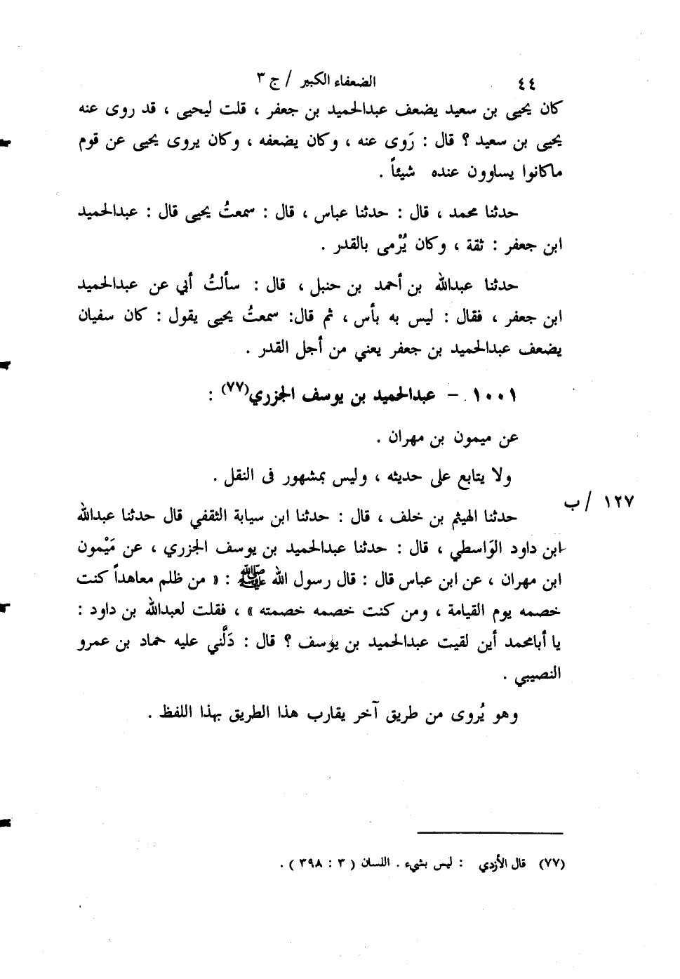 §1001 - عَبْدُ الْحَمِيدِ بْنُ يُوسُفَ الْجَزَرِيُّ عَنْ مَيْمُونِ بْنِ مِهْرَانَ، وَلَا يُتَابَعُ عَلَى حَدِيثِهِ، وَلَيْسَ بِمَشْهُورٍ بِالنَّقْلِ، مَجْهُولٌ