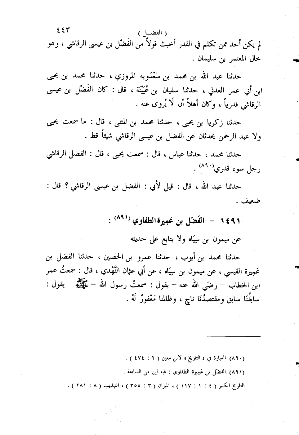 §1491 - الْفَضْلُ بْنُ عَمِيرَةَ الطُّفَاوِيُّ عَنْ مَيْمُونِ بْنِ سِيَاهٍ، وَلَا يُتَابَعُ عَلَى حَدِيثِهِ
