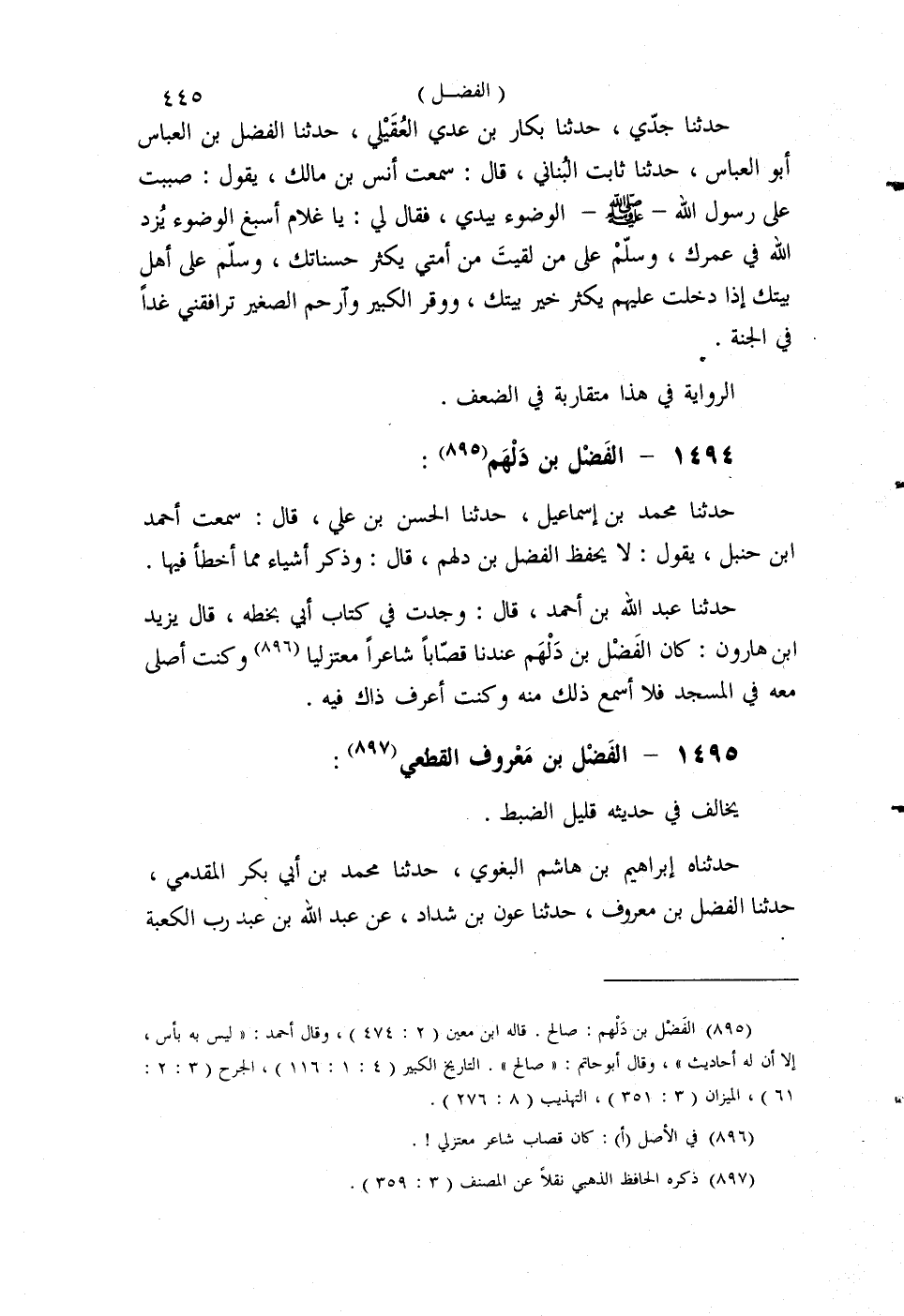 §1494 - الْفَضْلُ بْنُ دَلْهَمٍ حَدَّثَنَا مُحَمَّدُ بْنُ إِسْمَاعِيلَ، حَدَّثَنَا الْحَسَنُ بْنُ عَلِيٍّ قَالَ: سَمِعْتُ أَحْمَدَ بْنَ حَنْبَلٍ يَقُولُ: لَا يَحْفَظُ الْفَضْلُ بْنُ دَلْهَمٍ قَالَ: وَذَكَرَ أَشْيَاءَ مِمَّا أَخْطَأَ فِيهَا. حَدَّثَنَا عَبْدُ اللَّهِ بْنُ أَحْمَدَ قَالَ: وَجَدْتُ فِي كِتَابِ أَبِي بِخَطِّهِ: قَالَ يَزِيدُ بْنُ هَارُونَ: كَانَ الْفَضْلُ بْنُ دَلْهَمٍ عِنْدَنَا قَصَّابًا شَاعِرًا مُعْتَزِلِيًّا، وَكُنْتُ أُصَلِّي مَعَهُ فِي الْمَسْجِدِ فَلَا أَسْمَعُ ذَلِكَ مِنْهُ، وَكُنْتُ أَعْرِفُ ذَاكَ فِيهِ