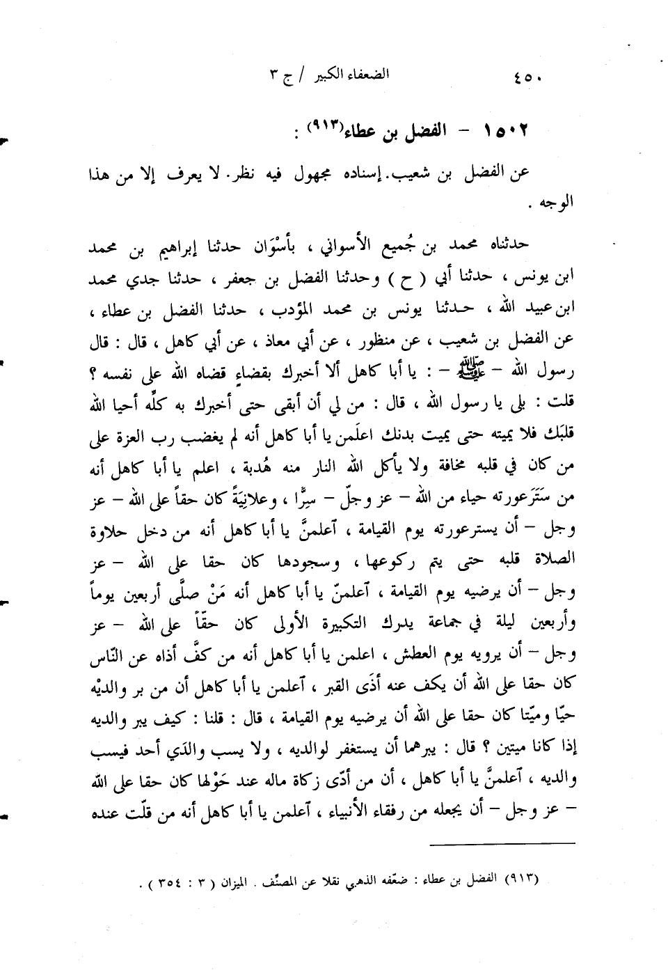 §1502 - الْفَضْلُ بْنُ عَطَاءٍ عَنِ الْفَضْلِ بْنِ شُعَيْبٍ، إِسْنَادُهُ مَجْهُولٌ، فِيهِ نَظَرٌ، لَا يُعْرَفُ إِلَّا مِنْ هَذَا الْوَجْهِ