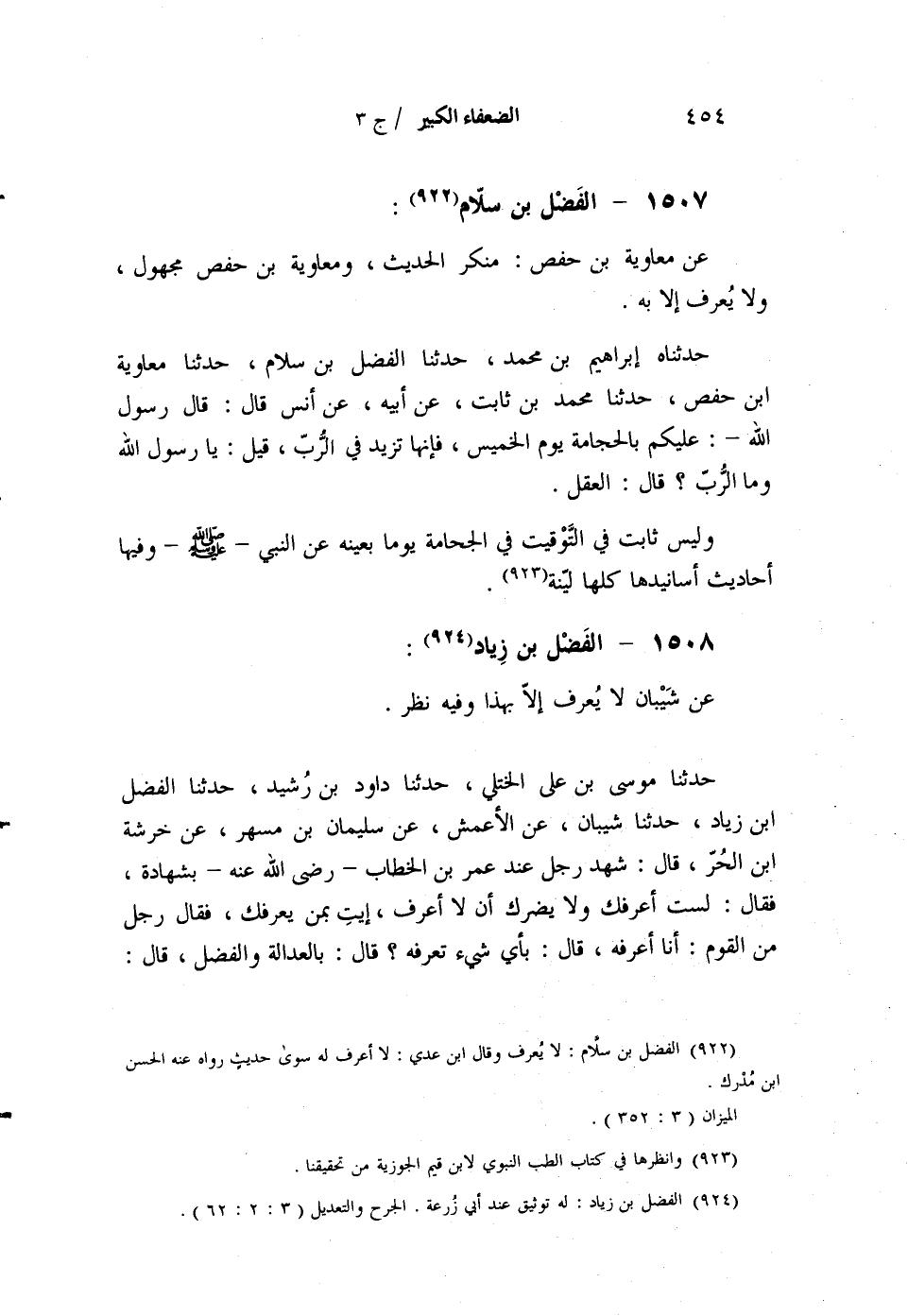 §1507 - الْفَضْلُ بْنُ سَلَّامٍ عَنْ مُعَاوِيَةَ بْنِ حَفْصٍ، مُنْكَرُ الْحَدِيثِ، وَمُعَاوِيَةُ بْنُ حَفْصٍ مَجْهُولٌ، وَلَا يُعْرَفُ إِلَّا بِهِ