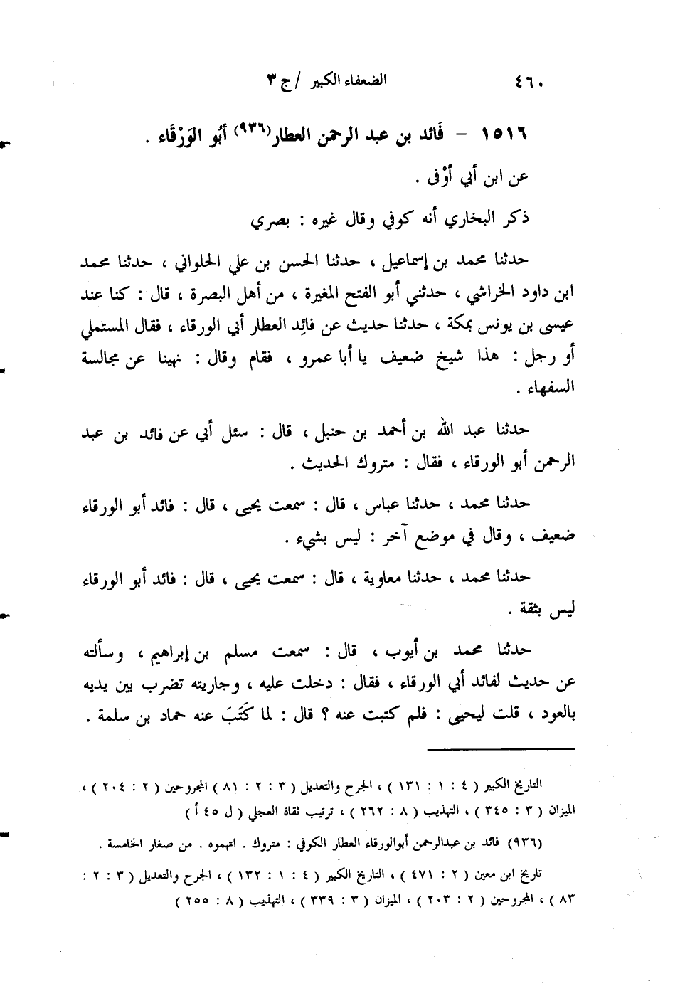 §1516 - فَائِدُ بْنُ عَبْدِ الرَّحْمَنِ الْعَطَّارُ أَبُو الْوَرْقَاءِ عَنِ ابْنِ أَبِي أَوْفَى، ذَكَرَ الْبُخَارِيُّ أَنَّهُ كُوفِيٌّ، وَقَالَ غَيْرُهُ: بَصْرِيٌّ. حَدَّثَنَا مُحَمَّدُ بْنُ إِسْمَاعِيلَ، حَدَّثَنَا الْحَسَنُ بْنُ عَلِيٍّ الْحُلْوَانِيُّ، حَدَّثَنَا مُحَمَّدُ بْنُ دَاوُدَ الْخَرَاشِيُّ، حَدَّثَنِي أَبُو الْفَتْحِ الْمُغِيرَةُ، مِنْ أَهْلِ الْبَصْرَةِ قَالَ: كُنَّا عِنْدَ عِيسَى بْنِ يُونُسَ بِمَكَّةَ حَدَّثَنَا حَدِيثٌ عَنْ فَائِدٍ الْعَطَّارِ أَبِي الْوَرْقَاءِ فَقَالَ الْمُسْتَمْلِيُّ أَوْ رَجُلٌ: هَذَا شَيْخٌ ضَعِيفٌ يَا أَبَا عَمْرٍو، فَقَامَ وَقَالَ: نُهِينَا عَنْ مُجَالَسَةِ السُّفَهَاءِ. حَدَّثَنَا عَبْدُ اللَّهِ بْنُ أَحْمَدَ بْنِ حَنْبَلٍ قَالَ: سُئِلَ أَبِي عَنْ فَائِدِ بْنِ عَبْدِ الرَّحْمَنِ أَبِي الْوَرْقَاءِ، فَقَالَ: مَتْرُوكُ الْحَدِيثِ. حَدَّثَنَا مُحَمَّدٌ، حَدَّثَنَا عَبَّاسٌ قَالَ: سَمِعْتُ يَحْيَى قَالَ: فَائِدٌ أَبُو الْوَرْقَاءِ ضَعِيفٌ، وَقَالَ فِي مَوْضِعٍ آخَرَ: لَيْسَ بِشَيْءٍ. حَدَّثَنَا مُحَمَّدٌ، حَدَّثَنَا مُعَاوِيَةُ قَالَ: سَمِعْتُ يَحْيَى قَالَ: فَائِدٌ أَبُو الْوَرْقَاءِ لَيْسَ بِثِقَةٍ. حَدَّثَنَا مُحَمَّدُ بْنُ أَيُّوبَ قَالَ: سَمِعْتُ مُسْلِمَ بْنَ إِبْرَاهِيمَ، وَسَأَلْتُهُ، عَنْ حَدِيثٍ، لِفَائِدٍ أَبِي الْوَرْقَاءِ فَقَالَ: دَخَلْتُ عَلَيْهِ وَجَارِيَتُهُ تَضْرِبُ بَيْنَ يَدَيْهِ بِالْعُودِ، قُلْتُ لِيَحْيَى: فَلِمَ كَتَبْتَ عَنْهُ؟ قَالَ: لَمَّا كَتَبَ عَنْهُ حَمَّادُ بْنُ سَلَمَةَ. حَدَّثَنِي آدَمُ قَالَ: سَمِعْتُ الْبُخَارِيَّ قَالَ: فَائِدُ بْنُ عَبْدِ الرَّحْمَنِ الْعَطَّارُ أَبُو الْوَرْقَاءِ مُنْكَرُ الْحَدِيثِ