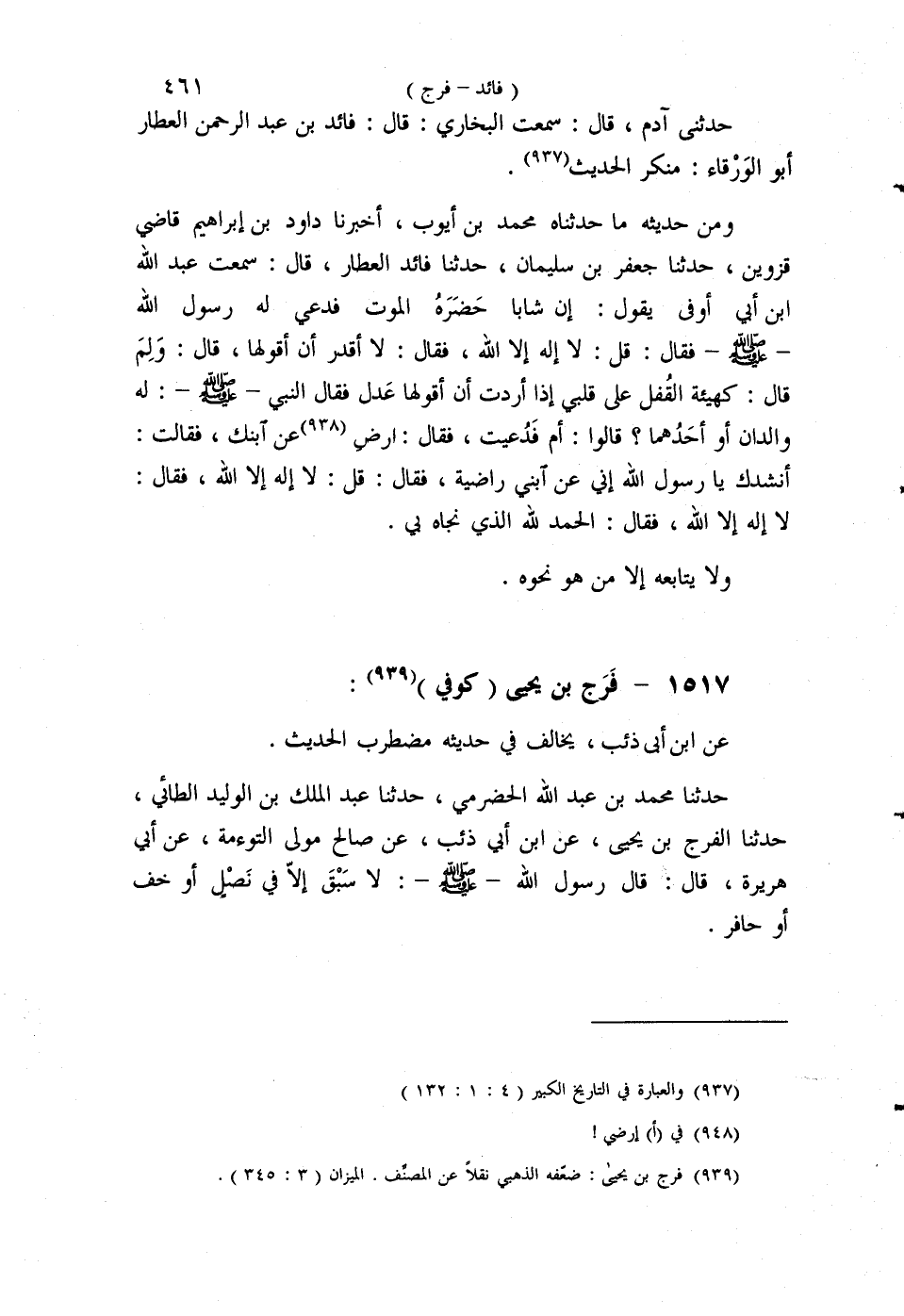 §1517 - فَرَجُ بْنُ يَحْيَى كُوفِيٌّ عَنِ ابْنِ أَبِي ذِئْبٍ، يُخَالِفُ فِي حَدِيثِهِ، مُضْطَرِبُ الْحَدِيثِ