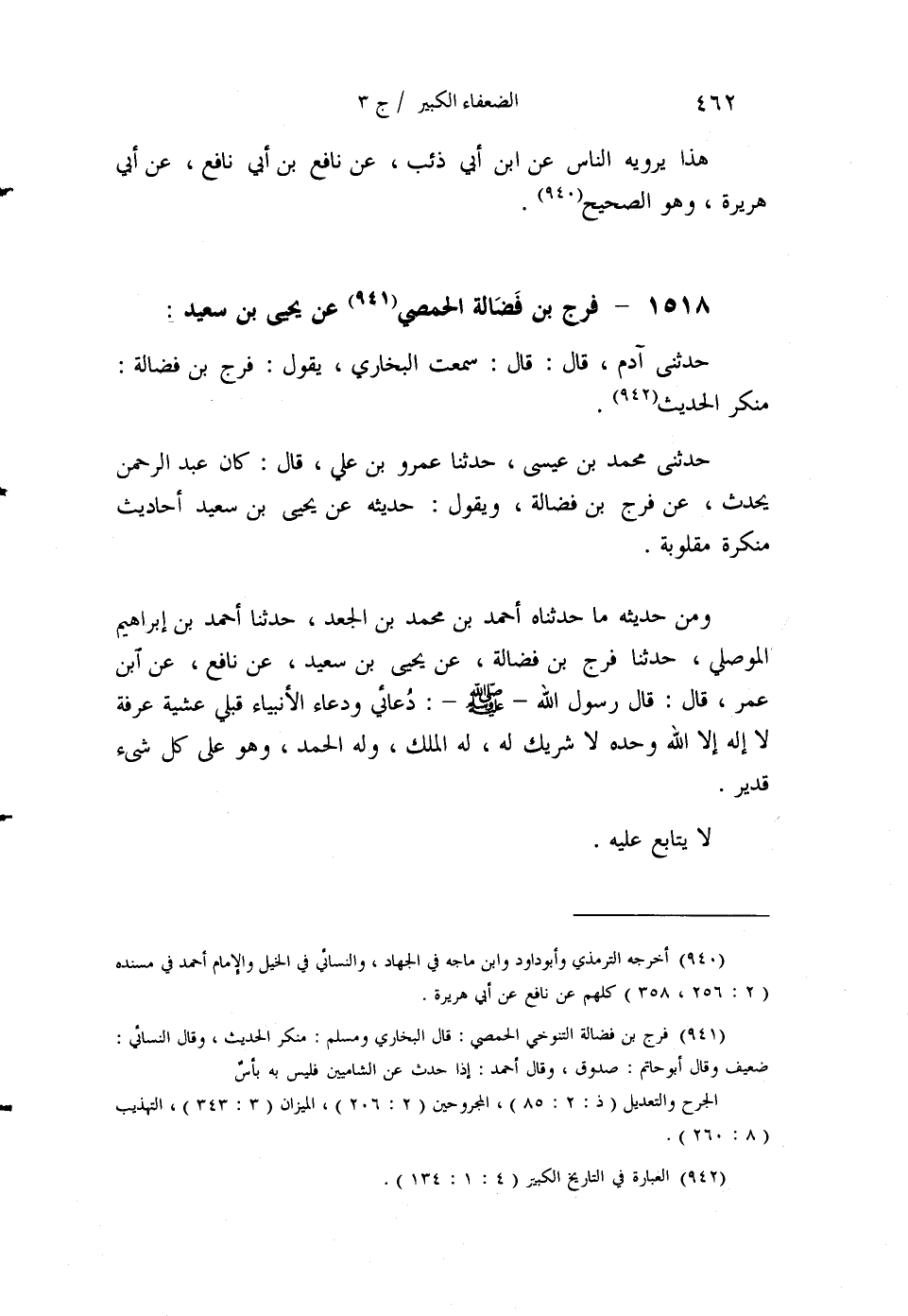 §1518 - فَرَجُ بْنُ فَضَالَةَ الْحِمْصِيُّ عَنْ يَحْيَى بْنِ سَعِيدٍ. حَدَّثَنِي آدَمُ قَالَ: سَمِعْتُ الْبُخَارِيَّ يَقُولُ: فَرَجُ بْنُ فَضَالَةَ مُنْكَرُ الْحَدِيثِ. حَدَّثَنِي مُحَمَّدُ بْنُ عِيسَى، حَدَّثَنَا عَمْرُو بْنُ عَلِيٍّ قَالَ: كَانَ عَبْدُ الرَّحْمَنِ يُحَدِّثُ عَنْ فَرَجِ بْنِ فَضَالَةَ، وَيَقُولُ: حَدِيثُهُ عَنْ يَحْيَى بْنِ سَعِيدٍ، أَحَادِيثٌ مُنْكَرَةٌ مَقْلُوبَةٌ