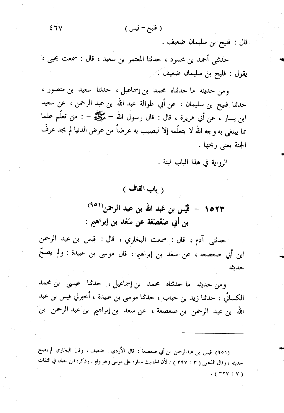 §1523 - قَيْسُ بْنُ عَبْدِ اللَّهِ بْنِ عَبْدِ الرَّحْمَنِ بْنِ أَبِي صَعْصَعَةَ عَنْ سَعْدِ بْنِ إِبْرَاهِيمَ. حَدَّثَنِي آدَمُ قَالَ: سَمِعْتُ الْبُخَارِيَّ قَالَ: قَيْسُ بْنُ عَبْدِ الرَّحْمَنِ بْنِ أَبِي صَعْصَعَةَ، عَنْ سَعْدِ بْنِ إِبْرَاهِيمَ، قَالَ مُوسَى بْنُ عُبَيْدَةَ: وَلَمْ يَصِحَّ