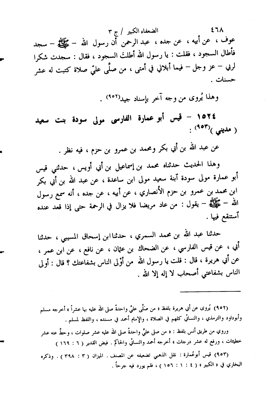 §1524 - قَيْسٌ أَبُو عُمَارَةَ الْفَارِسِيُّ مَوْلَى سَوْدَةَ بِنْتِ سَعِيدٍ مَدِينِيٌّ عَنْ عَبْدِ اللَّهِ بْنِ أَبِي بَكْرٍ، وَمُحَمَّدِ بْنِ عَمْرِو بْنِ حَزْمٍ، فِيهِ نَظَرٌ