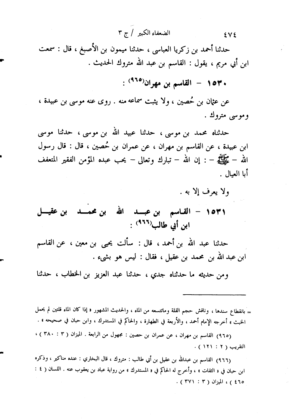 §1531 - الْقَاسِمُ بْنُ عَبْدِ اللَّهِ بْنِ مُحَمَّدِ بْنِ عَقِيلِ بْنِ أَبِي طَالِبٍ حَدَّثَنَا عَبْدُ اللَّهِ بْنُ أَحْمَدَ قَالَ: سَأَلْتُ يَحْيَى بْنَ مَعِينٍ عَنِ الْقَاسِمِ بْنِ عَبْدِ اللَّهِ بْنِ مُحَمَّدِ بْنِ عَقِيلٍ، فَقَالَ: لَيْسَ هُوَ بِشَيْءٍ