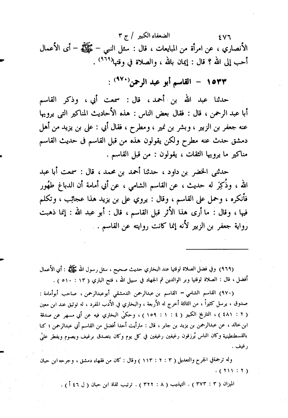 §1533 - الْقَاسِمُ أَبُو عَبْدِ الرَّحْمَنِ حَدَّثَنَا عَبْدُ اللَّهِ بْنُ أَحْمَدَ قَالَ: سَمِعْتُ أَبِي وَذَكَرَ الْقَاسِمَ أَبَا عَبْدِ الرَّحْمَنِ قَالَ: فَقَالَ بَعْضُ النَّاسِ: هَذِهِ الْأَحَادِيثُ الْمَنَاكِيرُ الَّتِي يَرْوِيهَا عَنْهُ جَعْفَرُ بْنُ الزُّبَيْرِ وَبِشْرُ بْنُ نُمَيْرٍ وَمُطَّرِحٌ فَقَالَ أَبِي: عَلِيُّ بْنُ يَزِيدَ مِنْ أَهْلِ دِمَشْقَ حَدَّثَ عَنْهُ مُطَّرِحٌ وَلَكِنْ يَقُولُونَ: هَذِهِ مِنْ قِبَلِ الْقَاسِمِ، فِي حَدِيثِ الْقَاسِمِ مَنَاكِيرُ مَا يَرْوِيهَا الثِّقَاتُ، يَقُولُونَ: مِنْ قِبَلِ الْقَاسِمِ حَدَّثَنِي الْخَضِرُ بْنُ دَاوُدَ، حَدَّثَنَا أَحْمَدُ بْنُ مُحَمَّدٍ قَالَ: سَمِعْتُ أَبَا عَبْدِ اللَّهِ، وَذُكِرَ، لَهُ حَدِيثٌ عَنِ الْقَاسِمِ الشَّامِيِّ، عَنْ أَبِي أُمَامَةَ، أَنَّ الدِّبَاغَ، طَهُورٌ فَأَنْكَرَهُ وَحَمَلَ عَلَى الْقَاسِمِ وَقَالَ: يَرْوِي عَلَى يَزِيدَ هَذَا عَجَائِبَ، وَتَكَلَّمَ فِيهَا، وَقَالَ: مَا أَرَى هَذَا الْأَثَرَ مِنْ قِبَلٍ الْقَاسِمِ، قَالَ أَبُو عَبْدِ اللَّهِ: إِنَّمَا ذَهَبَتْ رِوَايَةُ جَعْفَرِ بْنِ الزُّبَيْرِ؛ لِأَنَّهُ إِنَّمَا كَانَتْ رِوَايَتُهُ عَنِ الْقَاسِمِ. قَالَ أَبُو عَبْدِ اللَّهِ: لَمَّا حَدَّثَ بِشْرُ بْنُ نُمَيْرٍ عَنِ الْقَاسِمِ قَالَ شُعْبَةُ: أَلْحِقُوهُ بِهِ، قَالَ الْقَاسِمُ: أَلْحِقُوهُ بِهِ