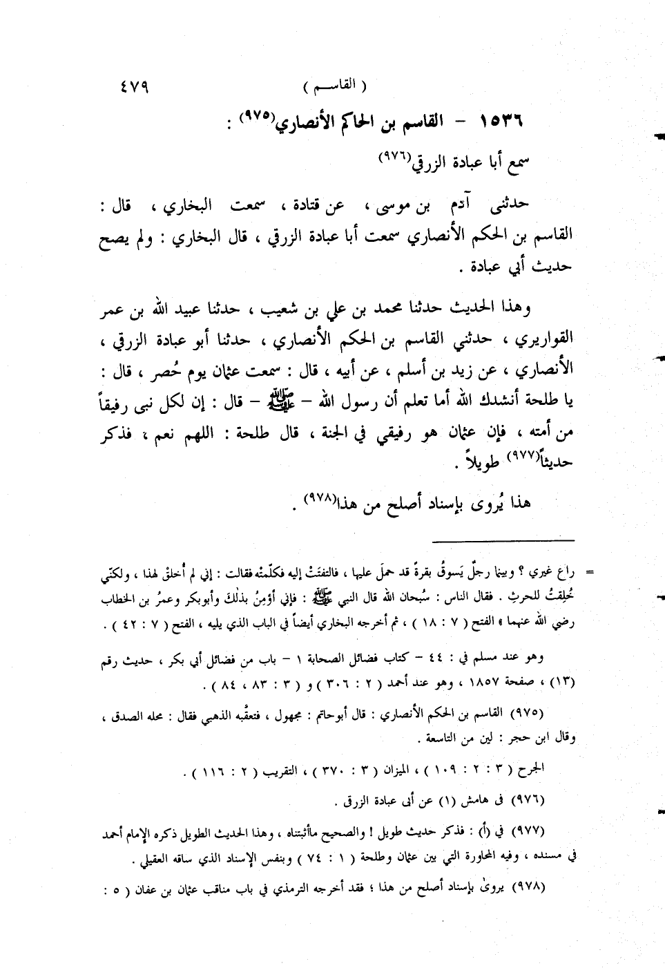 §1536 - الْقَاسِمُ بْنُ الْحَكَمِ الْأَنْصَارِيُّ حَدَّثَنِي آدَمُ بْنُ مُوسَى، عَنْ قَتَادَةَ، سَمِعْتُ الْبُخَارِيَّ قَالَ: الْقَاسِمُ بْنُ الْحَكَمِ الْأَنْصَارِيُّ، سَمِعْتُ أَبَا عُبَادَةَ الزُّرَقِيَّ، قَالَ الْبُخَارِيُّ: وَلَمْ يَصِحَّ حَدِيثُ أَبِي عُبَادَةَ