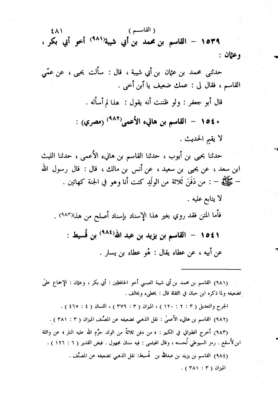 §1539 - الْقَاسِمُ بْنُ مُحَمَّدِ بْنِ أَبِي شَيْبَةَ أَخُو أَبِي بَكْرٍ وَعُثْمَانَ حَدَّثَنِي مُحَمَّدُ بْنُ عُثْمَانَ بْنِ أَبِي شَيْبَةَ قَالَ: سَأَلْتُ يَحْيَى عَنْ عَمِّيَ الْقَاسِمِ، فَقَالَ لِي: عَمُّكَ ضَعِيفٌ يَا ابْنَ أَخِي. قَالَ أَبُو جَعْفَرٍ: وَلَوْ ظَنَنْتُ أَنَّهُ يَقُولُ هَذَا لَمْ أَسْأَلْهُ