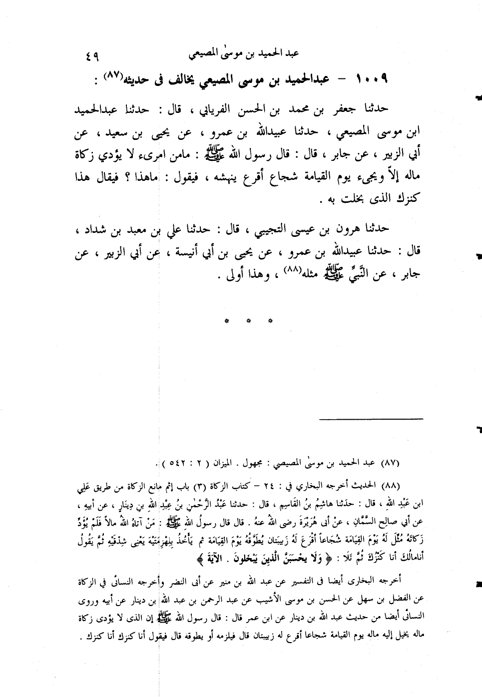 حَدَّثَنَا جَعْفَرُ بْنُ مُحَمَّدِ بْنِ الْحَسَنِ الْفِرْيَابِيُّ قَالَ: حَدَّثَنَا عَبْدُ الْحَمِيدِ بْنُ مُوسَى الْمِصِّيصِيُّ، حَدَّثَنَا عُبَيْدُ اللَّهِ بْنُ عَمْرٍو، عَنْ يَحْيَى بْنِ سَعِيدٍ، عَنْ أَبِي الزُّبَيْرِ، عَنْ جَابِرٍ قَالَ: قَالَ رَسُولُ اللَّهِ صَلَّى اللهُ عَلَيْهِ وَسَلَّمَ: §" مَا مِنَ امْرِئٍ لَا يُؤَدِّي زَكَاةَ مَالِهِ إِلَّا وَيَجِيءُ يَوْمَ الْقِيَامَةِ شُجَاعٌ أَقْرَعُ يَنْهَشُهُ فَيَقُولُ مَا هَذَا؟ فَيُقَالُ: هَذَا كَنْزُكَ الَّذِي بَخِلْتَ بِهِ " حَدَّثَنَا هَارُونُ بْنُ عِيسَى التُّجِيبِيُّ قَالَ: حَدَّثَنَا عَلِيُّ بْنُ مَعْبَدِ بْنِ شَدَّادٍ قَالَ: حَدَّثَنَا عُبَيْدُ اللَّهِ بْنُ عَمْرٍو، عَنْ يَحْيَى بْنِ أَبِي أُنَيْسَةَ، عَنْ أَبِي الزُّبَيْرِ، عَنْ جَابِرٍ، عَنِ النَّبِيِّ صَلَّى اللهُ عَلَيْهِ وَسَلَّمَ مِثْلَهُ. وَهَذَا أَوْلَى