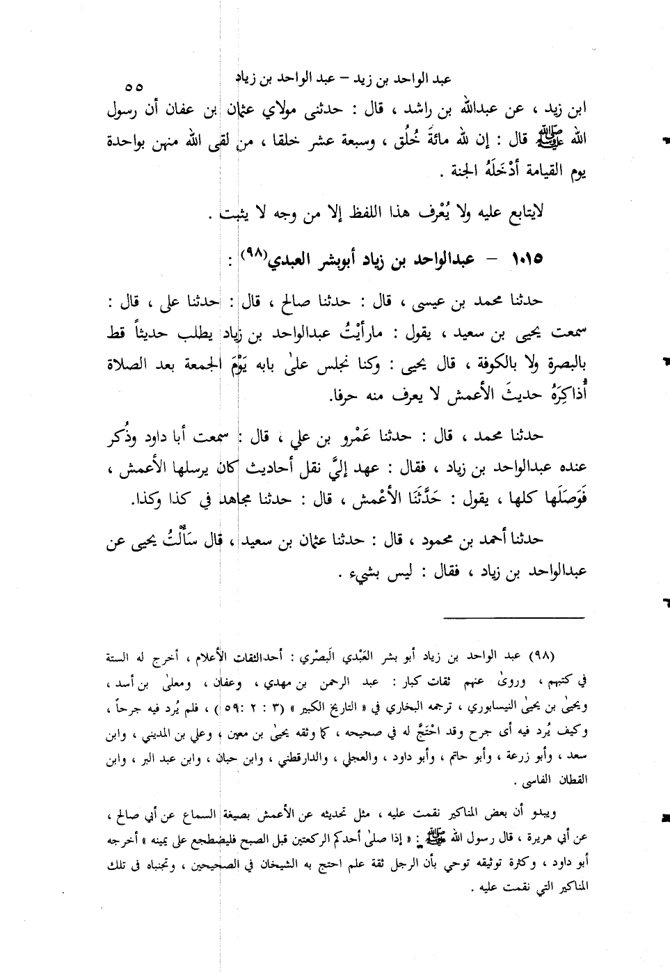 §1015 - عَبْدُ الْوَاحِدِ بْنُ زِيَادٍ أَبُو بِشْرٍ الْعَبْدِيِّ حَدَّثَنَا مُحَمَّدُ بْنُ عِيسَى قَالَ: حَدَّثَنَا صَالِحٌ قَالَ: حَدَّثَنَا عَلِيٌّ قَالَ: سَمِعْتُ يَحْيَى بْنَ سَعِيدٍ يَقُولُ: مَا رَأَيْتُ عَبْدَ الْوَاحِدِ بْنَ زِيَادٍ يَطْلُبُ حَدِيثًا قَطُّ بِالْبَصْرَةِ وَلَا بِالْكُوفَةِ. قَالَ يَحْيَى: وَكُنَّا نَجْلِسُ عَلَى بَابِهِ يَوْمَ الْجُمُعَةِ بَعْدَ الصَّلَاةِ أُذَاكِرُهُ حَدِيثَ الْأَعْمَشِ لَا يُعْرَفُ مِنْهُ حَرْفًا. حَدَّثَنَا مُحَمَّدٌ قَالَ: حَدَّثَنَا عَمْرُو بْنُ عَلِيٍّ قَالَ: سَمِعْتُ أَبَا دَاوُدَ، وَذُكِرَ عَبْدُ الْوَاحِدِ بْنُ زِيَادٍ فَقَالَ: عَمِدَ إِلَيَّ أَحَادِيثَ كَانَ يُرْسِلُهَا الْأَعْمَشُ فَوَصَلَهَا كُلَّهَا، يَقُولُ: حَدَّثَنَا الْأَعْمَشُ قَالَ: حَدَّثَنَا مُجَاهِدٌ فِي كَذَا وَكَذَا. حَدَّثَنَا أَحْمَدُ بْنُ مَحْمُودٍ قَالَ: حَدَّثَنَا عُثْمَانُ بْنُ سَعِيدٍ قَالَ: سَأَلْتُ يَحْيَى عَنْ عَبْدِ الْوَاحِدِ بْنِ زِيَادٍ، فَقَالَ: لَيْسَ بِشَيْءٍ
