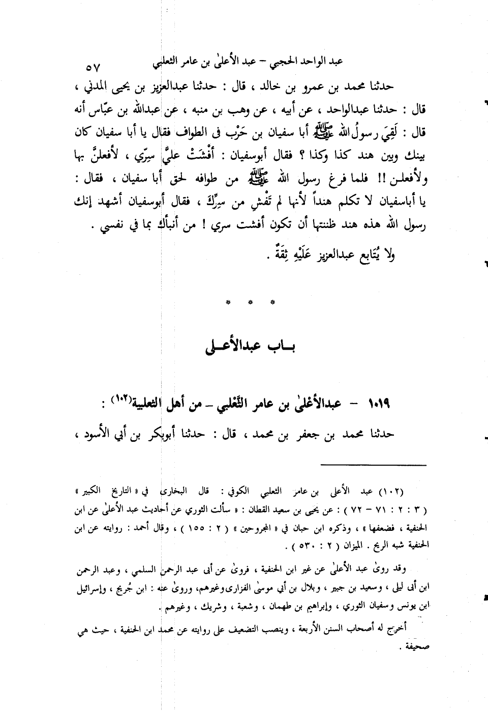 §1019 - عَبْدُ الْأَعْلَى بْنُ عَامِرٍ الثَّعْلَبِيُّ، مِنْ أَهْلِ الثَّعْلَبِيَّةِ حَدَّثَنَا مُحَمَّدُ بْنُ جَعْفَرِ بْنِ مُحَمَّدٍ قَالَ: حَدَّثَنَا أَبُو بَكْرِ بْنُ أَبِي الْأَسْوَدِ قَالَ: سَمِعْتُ يَحْيَى بْنَ سَعِيدٍ قَالَ: سَأَلْتُ الثَّوْرِيَّ عَنْ حَدِيثِ عَبْدِ الْأَعْلَى، عَنِ ابْنِ الْحَنَفِيَّةِ، فَضَعَّفَهَا. حَدَّثَنَا عَبْدُ اللَّهِ بْنُ أَحْمَدَ قَالَ: سَمِعْتُ أَبِي قَالَ: عَبْدُ الْأَعْلَى، عَنِ ابْنِ الْحَنَفِيَّةِ، عَنْ عَلِيٍّ، شِبْهُ الرِّيحِ، كَأَنَّهُ لَمْ يُصَحِّحْهَا، قُلْتُ لِأَبِي: لِمَ؟ قَالَ: وَقَعَ إِلَيْهِ كِتَابُ الْحَارِثِ الْأَعْوَرِ. حَدَّثَنَا عَبْدُ اللَّهِ قَالَ: سُئِلَ أَبِي عَنْ عَبْدِ الْأَعْلَى الثَّعْلَبِيِّ، ضَعِيفٌ هُوَ؟ فَقَالَ: قَالَ عَبْدُ الرَّحْمَنِ: سَأَلْتُ سُفْيَانَ عَنْ حَدِيثِ عَبْدِ الْأَعْلَى فَقَالَ: كُنَّا نَرَى أَنَّهَا مِنْ كِتَابِ حَدِيثِ ابْنِ الْحَنَفِيَّةِ، وَلَمْ يَسْمَعْ مِنْهُ شَيْئًا. قَالَ أَبِي مَرَّةً أُخْرَى: عَبْدُ الْأَعْلَى الثَّعْلَبِيُّ ضَعِيفُ الْحَدِيثِ. وَسُئِلَ أَبِي مَرَّةً أُخْرَى عَنْ عَبْدِ الْأَعْلَى الثَّعْلَبِيِّ فَقَالَ: هُوَ كَذَا وَكَذَا. حَدَّثَنَا مُحَمَّدُ بْنُ عِيسَى قَالَ: حَدَّثَنَا صَالِحٌ قَالَ: حَدَّثَنَا عَلِيُّ بْنُ الْمَدِينِيِّ قَالَ: سَأَلْتُ يَحْيَى عَنْ عَبْدِ الْأَعْلَى الثَّعْلَبِيِّ، فَقَالَ: يُعْرَفُ وَيُنْكَرُ. حَدَّثَنَا مُحَمَّدُ بْنُ زَكَرِيَّا قَالَ: حَدَّثَنَا مُحَمَّدُ بْنُ الْمُثَنَّى قَالَ: مَا سَمِعْتُ يَحْيَى بْنَ سَعِيدٍ الْقَطَّانَ يُحَدِّثُ عَنْ سُفْيَانَ، عَنْ عَبْدِ الْأَعْلَى الثَّعْلَبِيِّ، وَمَا سَمِعْتُ عَبْدَ الرَّحْمَنِ، حَدَّثَ عَنْهُ شَيْئًا قَطُّ. حَدَّثَنَا مُحَمَّدُ بْنُ عِيسَى قَالَ: حَدَّثَنَا عَمْرُو بْنُ عَلِيٍّ قَالَ: كَانَ يَحْيَى لَا يُحَدِّثُ عَنْ عَبْدِ الْأَعْلَى الثَّعْلَبِيِّ