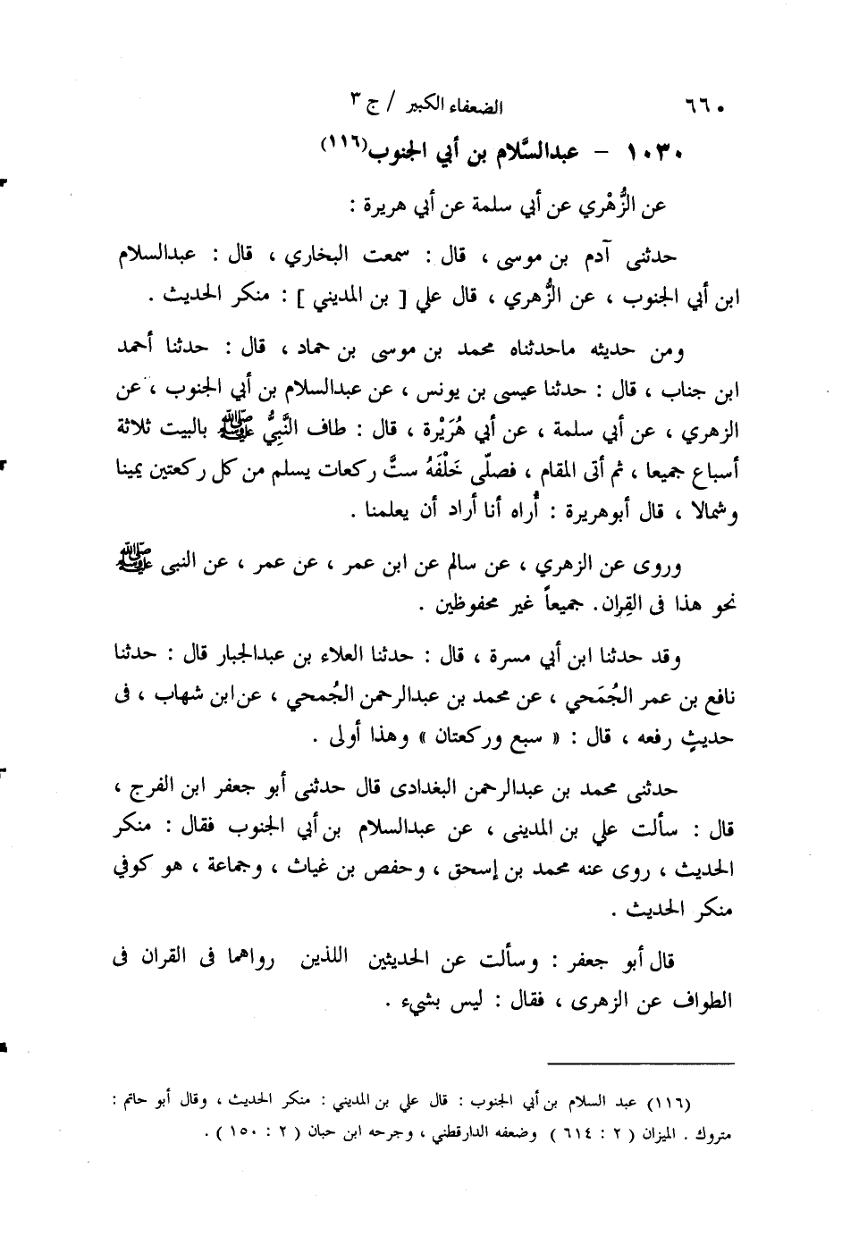 §1030 - عَبْدُ السَّلَامِ بْنُ أَبِي الْجَنُوبِ عَنِ الزُّهْرِيِّ، عَنْ أَبِي سَلَمَةَ، عَنْ أَبِي هُرَيْرَةَ. حَدَّثَنِي آدَمُ بْنُ مُوسَى قَالَ: سَمِعْتُ الْبُخَارِيَّ قَالَ: عَبْدُ السَّلَامِ بْنُ أَبِي الْجَنُوبِ عَنِ الزُّهْرِيِّ، قَالَ عَلِيٌّ: مُنْكَرُ الْحَدِيثِ