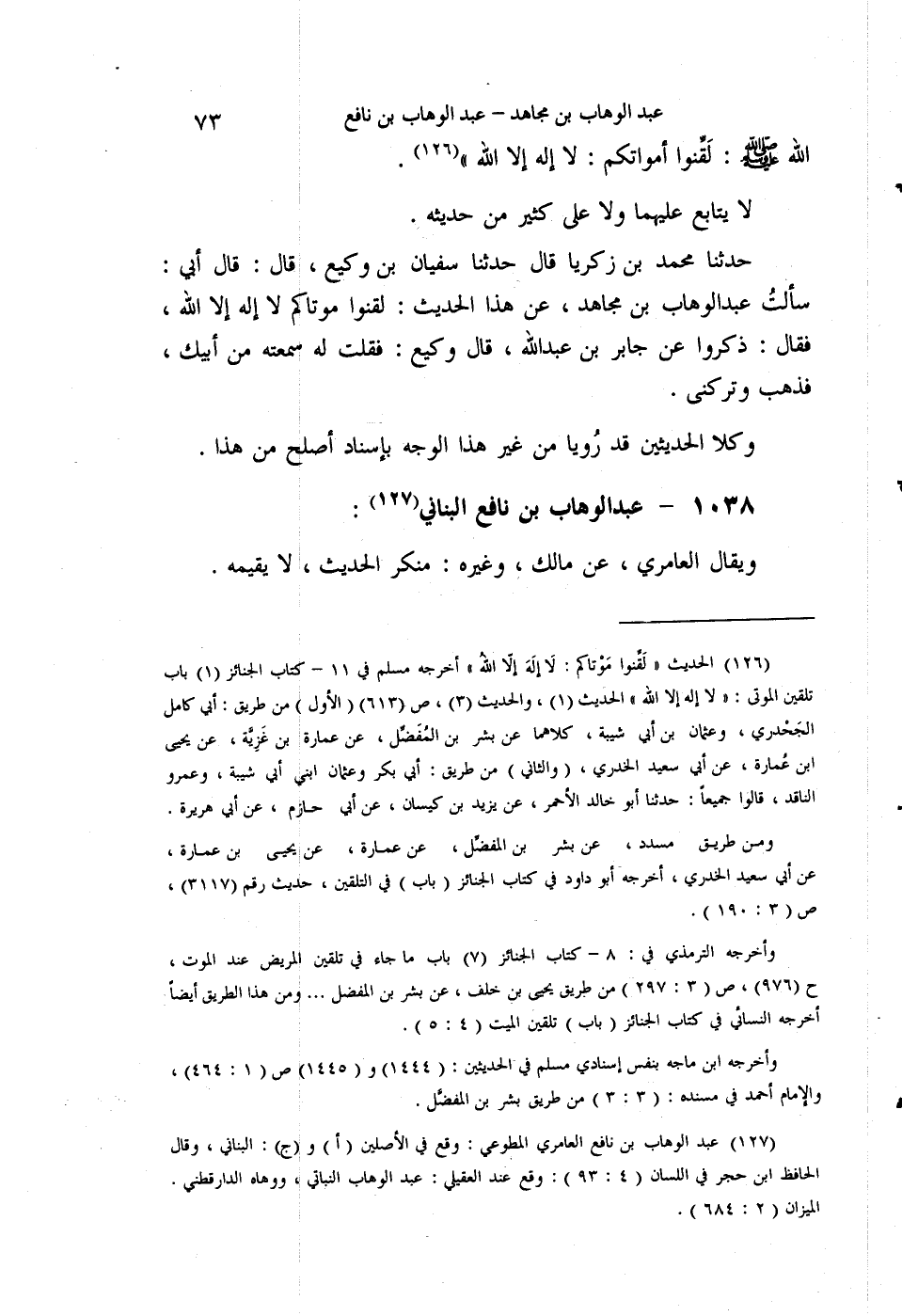 §1038 - عَبْدُ الْوَهَّابِ بْنُ نَافِعٍ الْبُنَانِيُّ وَيُقَالُ الْعَامِرِيُّ، عَنْ مَالِكٍ، وَغَيْرِهِ، مُنْكَرُ الْحَدِيثِ، لَا يُقِيمُهُ