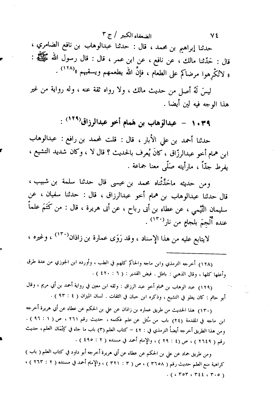§1039 - عَبْدُ الْوَهَّابِ بْنُ هَمَّامٍ أَخُو عَبْدِ الرَّزَّاقِ حَدَّثَنَا أَحْمَدُ بْنُ عَلِيٍّ الْأَبَّارُ قَالَ: قُلْتُ لِمُحَمَّدِ بْنِ رَافِعٍ: عَبْدُ الْوَهَّابِ بْنُ هَمَّامٍ أَخُو عَبْدِ الرَّزَّاقِ كَانَ يُعْرَفُ بِالْحَدِيثِ؟ قَالَ: لَا، وَكَانَ شَدِيدَ التَّشَيُّعِ يُفْرِطُ جِدًّا، مَا رَأَيْتُهُ صَلَّى مَعَنَا جَمَاعَةً