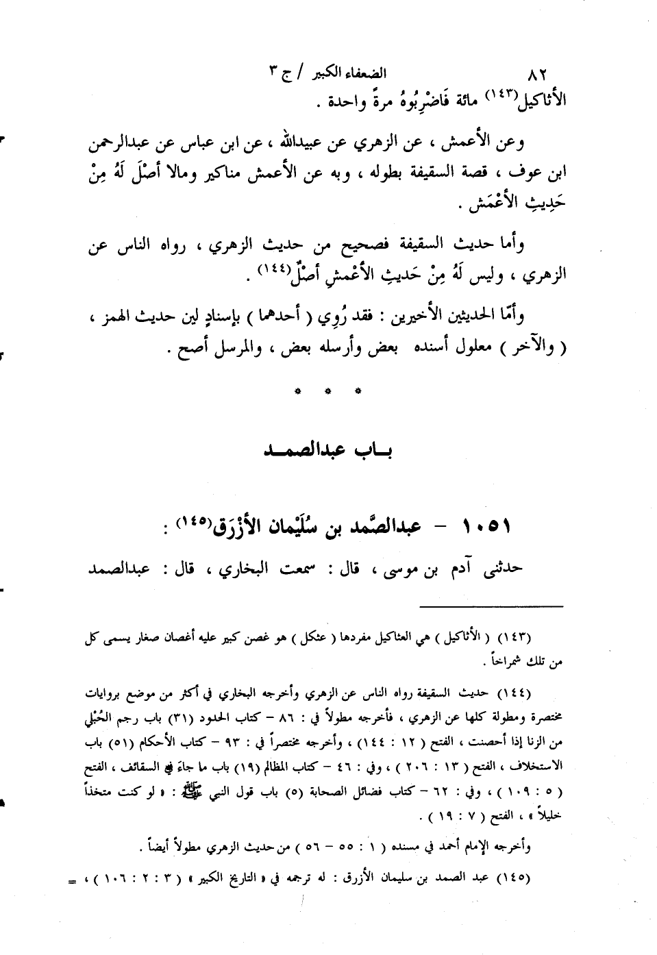 §1051 - عَبْدُ الصَّمَدِ بْنُ سُلَيْمَانَ الْأَزْرَقُ حَدَّثَنِي آدَمُ بْنُ مُوسَى قَالَ: سَمِعْتُ الْبُخَارِيَّ قَالَ: عَبْدُ الصَّمَدِ بْنُ سُلَيْمَانَ الْأَزْرَقُ رَوَى عَنْهُ، سَعْدَوَيْهِ وَغَيْرُهُ مُنْكَرُ الْحَدِيثِ