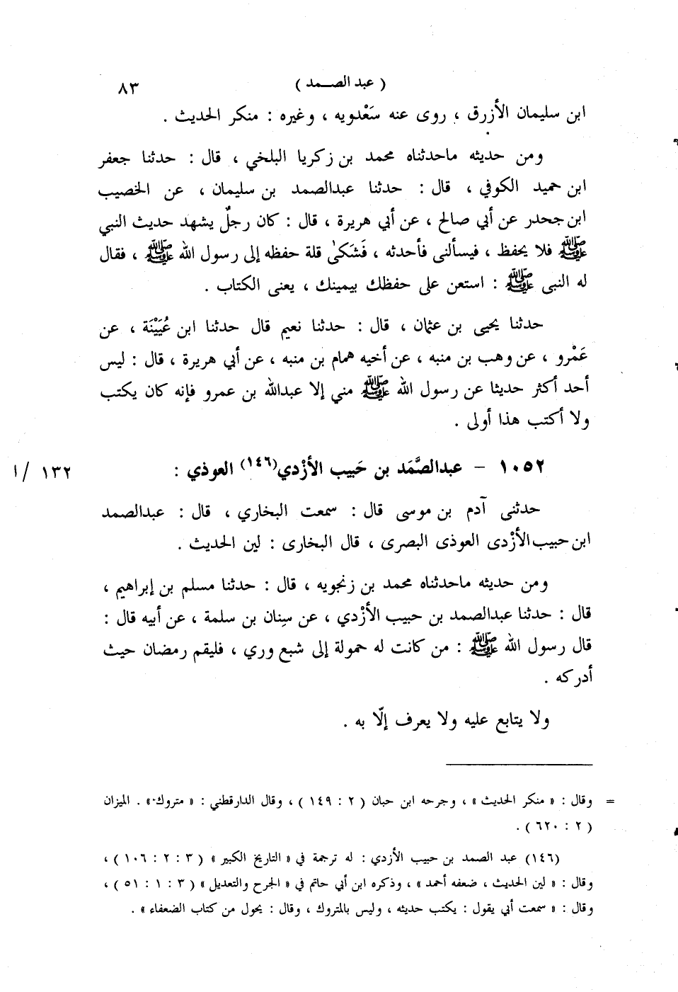 §1052 - عَبْدُ الصَّمَدِ بْنُ حَبِيبٍ الْأَزْدِيُّ الْعَوْذِيُّ حَدَّثَنِي آدَمُ بْنُ مُوسَى قَالَ: سَمِعْتُ الْبُخَارِيَّ قَالَ: عَبْدُ الصَّمَدِ بْنُ حَبِيبٍ الْأَزْدِيُّ الْعَوْذِيُّ الْبَصْرِيُّ قَالَ الْبُخَارِيُّ: لَيِّنُ الْحَدِيثِ