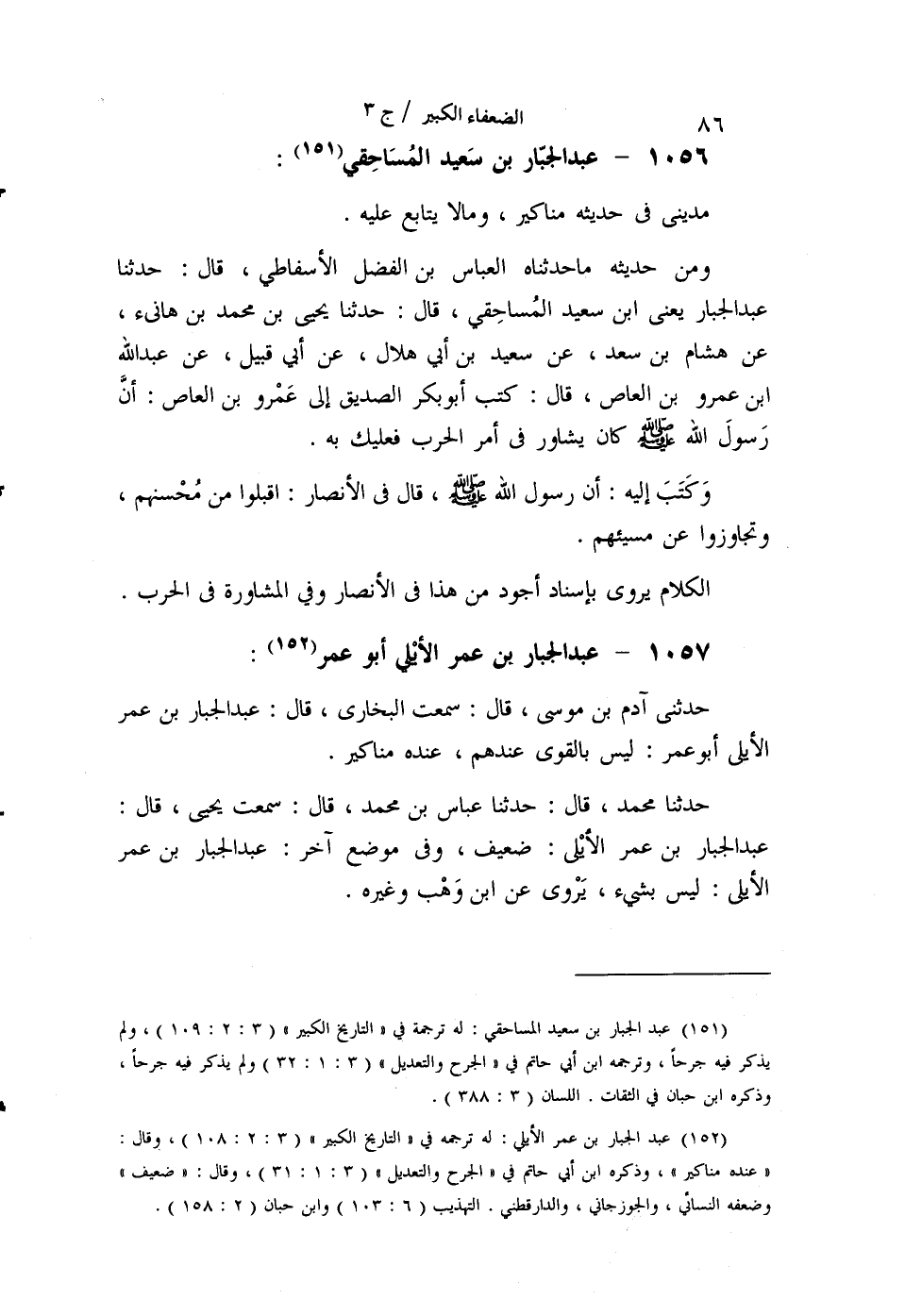 §1057 - عَبْدُ الْجَبَّارِ بْنُ عُمَرَ الْأَيْلِيُّ أَبُو عُمَرَ حَدَّثَنِي آدَمُ بْنُ مُوسَى قَالَ: سَمِعْتُ الْبُخَارِيَّ قَالَ: عَبْدُ الْجَبَّارِ بْنُ عُمَرَ الْأَيْلِيُّ أَبُو عُمَرَ لَيْسَ بِالْقَوِيِّ عِنْدَهُمْ، عِنْدَهُ مَنَاكِيرُ. حَدَّثَنَا مُحَمَّدٌ قَالَ: حَدَّثَنَا عَبَّاسُ بْنُ مُحَمَّدٍ قَالَ: سَمِعْتُ يَحْيَى قَالَ: عَبْدُ الْجَبَّارِ بْنُ عُمَرَ الْأَيْلِيُّ ضَعِيفٌ، وَفِي مَوْضِعٍ آخَرَ: عَبْدُ الْجَبَّارِ بْنُ عُمَرَ الْأَيْلِيُّ لَيْسَ بِشَيْءٍ يَرْوِي عَنِ ابْنِ وَهْبٍ وَغَيْرِهِ
