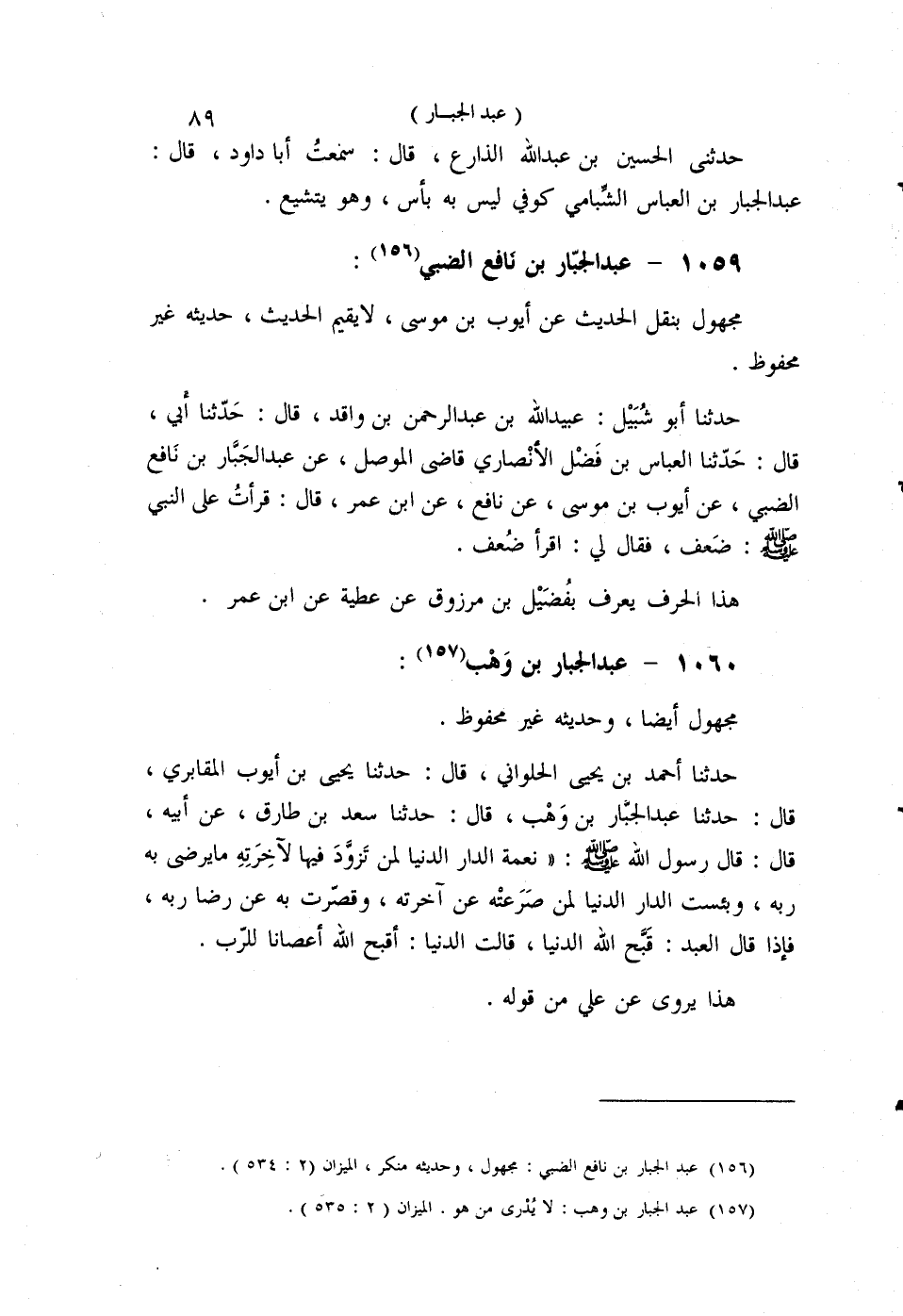 §1059 - عَبْدُ الْجَبَّارِ بْنُ نَافِعٍ الضَّبِّيُّ مَجْهُولٌ بِنَقْلِ الْحَدِيثِ عَنْ أَيُّوبَ بْنِ مُوسَى، لَا يُقِيمُ الْحَدِيثَ، حَدِيثُهُ غَيْرُ مَحْفُوظٍ