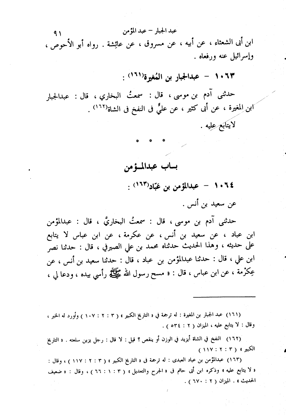 §1063 - عَبْدُ الْجَبَّارِ بْنُ الْمُغِيرَةِ حَدَّثَنِي آدَمُ بْنُ مُوسَى قَالَ: سَمِعْتُ الْبُخَارِيَّ قَالَ: عَبْدُ الْجَبَّارِ بْنُ الْمُغِيرَةِ عَنْ أَمِّ كَثِيرَةَ، عَنْ عَلِيٍّ، فِي النَّفْخِ فِي الشَّاةِ لَا يُتَابَعُ عَلَيْهِ