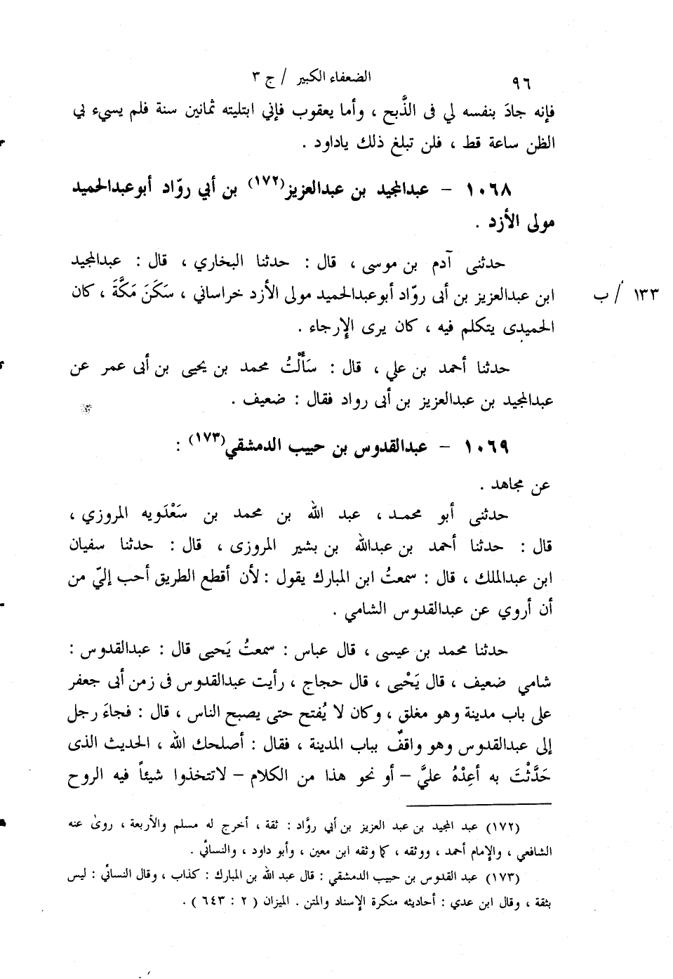 §1068 - عَبْدُ الْمَجِيدِ بْنُ عَبْدِ الْعَزِيزِ بْنِ أَبِي رَوَّادٍ أَبُو عَبْدِ الْحَمِيدِ مَوْلَى الْأَزْدِ حَدَّثَنِي آدَمُ بْنُ مُوسَى قَالَ: حَدَّثَنَا الْبُخَارِيُّ قَالَ: عَبْدُ الْمَجِيدِ بْنُ عَبْدِ الْعَزِيزِ بْنِ أَبِي رَوَّادٍ أَبُو عَبْدِ الْحَمِيدِ مَوْلَى الْأَزْدِ خُرَاسَانِيُّ سَكَنَ مَكَّةَ، كَانَ الْحُمَيْدِيُّ يَتَكَلَّمُ فِيهِ، كَانَ يَرَى الْإِرْجَاءَ. حَدَّثَنَا أَحْمَدُ بْنُ عَلِيٍّ قَالَ: سَأَلْتُ مُحَمَّدَ بْنَ يَحْيَى بْنِ أَبِي عُمَرَ عَنْ عَبْدِ الْمَجِيدِ بْنِ عَبْدِ الْعَزِيزِ بْنِ أَبِي رَوَّادٍ، فَقَالَ: ضَعِيفٌ