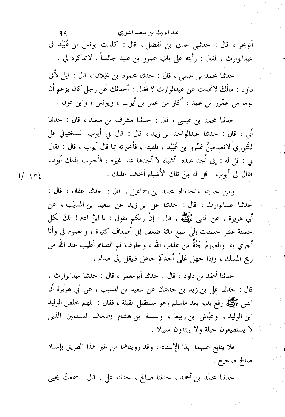 حَدَّثَنَا أَحْمَدُ بْنُ دَاوُدَ قَالَ: حَدَّثَنَا أَبُو مَعْمَرٍ قَالَ: حَدَّثَنَا عَبْدُ الْوَارِثِ قَالَ: حَدَّثَنَا عَلِيُّ بْنُ زَيْدِ بْنِ جُدْعَانَ، عَنْ سَعِيدِ بْنِ الْمُسَيِّبِ، عَنْ أَبِي هُرَيْرَةَ، أَنَّ النَّبِيَّ صَلَّى اللهُ عَلَيْهِ وَسَلَّمَ رَفَعَ يَدَيْهِ بَعْدَ مَا سَلَّمَ وَهُوَ مُسْتَقْبِلٌ الْقِبْلَةَ فَقَالَ: §«اللَّهُمَّ خَلِّصِ الْوَلِيدَ بْنَ الْوَلِيدِ وَعَيَّاشَ بْنَ أَبِي رَبِيعَةَ وَسَلَمَةَ بْنَ هِشَامٍ وَضُعَفَاءَ الْمُسْلِمِينَ الَّذِينَ لَا يَسْتَطِيعُونَ حِيلَةً وَلَا يَهْتَدُونَ سَبِيلًا» لَا يُتَابَعُ عَلَيْهِمَا بِهَذَا الْإِسْنَادِ، وَقَدْ رُوِّينَا مِنْ غَيْرِ هَذَا الطَّرِيقِ بِإِسْنَادٍ صَالِحٍ صَحِيحٍ حَدَّثَنَا مُحَمَّدُ بْنُ أَحْمَدَ، قَالَ حَدَّثَنَا صَالِحٌ، حَدَّثَنَا عَلِيٌّ قَالَ: سَمِعْتُ يَحْيَى، وَذُكِرَ لَهُ أَنَّ عَبْدَ الْوَارِثِ قَالَ: سَأَلْتُ شُعْبَةَ عَنِ الْخُرُوجِ مَعَ إِبْرَاهِيمَ فَأَمَرَنِي بِهِ، وَأَنْكَرَ ذَلِكَ يَحْيَى وَقَالَ: كَانَ شُعْبَةُ لَا يَرَى رَأْيَ سُفْيَانَ، وَلَا يَرَى الْخُرُوجَ مَعَ عَلِيٍّ، يَرَى الْخُرُوجَ مَعَ إِبْرَاهِيمَ؟ قَالَ عَلِيٌّ: قُلْتُ لِيَحْيَى: سَمِعْتَ أَنْتَ شُعْبَةَ يَقُولُ فِي هَذَا شَيْئًا؟ قَالَ: سَمِعْتُهُ يَقُولُ: مَا أَدْرِي أَخْطَأُوا أَمْ أَصَابُوا قَالَ يَحْيَى: وَرَأَيْتَ