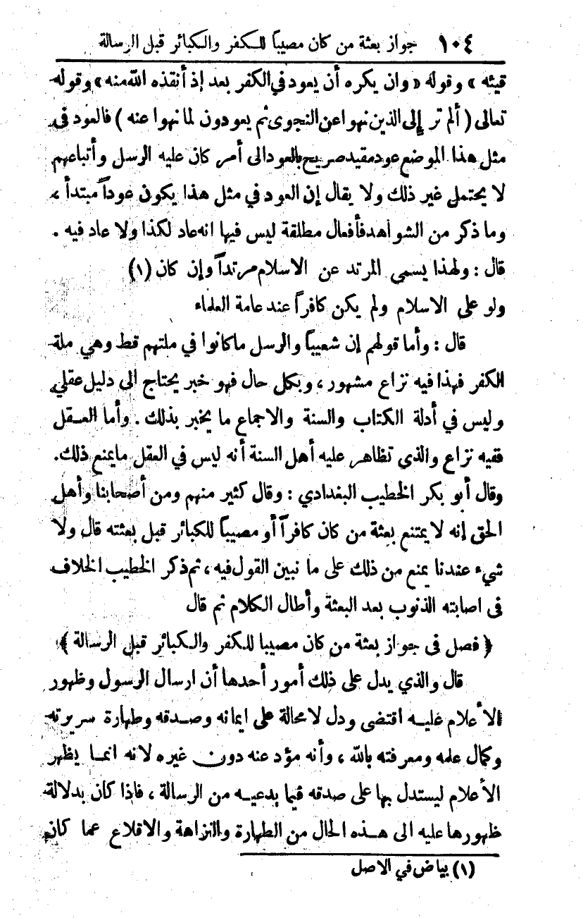 قال: وأما قولهم: إن شعيبًا والرسل ما كانوا في ملتهم قط، وهي ملة الكفر فهذا فيه نزاع مشهور، وبكل حال فهو خبر يحتاج إلى دليل عقلي، وليس في أدلة الكتاب والسنة والإجماع ما يخبر بذلك، وأما العقل ففيه نزاع، والذي تظاهر عليه أهل السنة أنه ليس في العقل ما يمنع ذلك. وقال أبو بكر الخطيب البغدادي: وقال كثير منهم، ومن أصحابنا، وأهل الحق: إنه لا يمتنع بعثة من كان كافرا، أو مصيبا للكبائر قبل بعثته، قال: ولا شيء عندنا يمنع من ذلك على ما نبين القول فيه، ثم ذكر الخطيب الخلاف في إصابته الذنوب بعد البعثة، وأطال الكلام ثم قال: