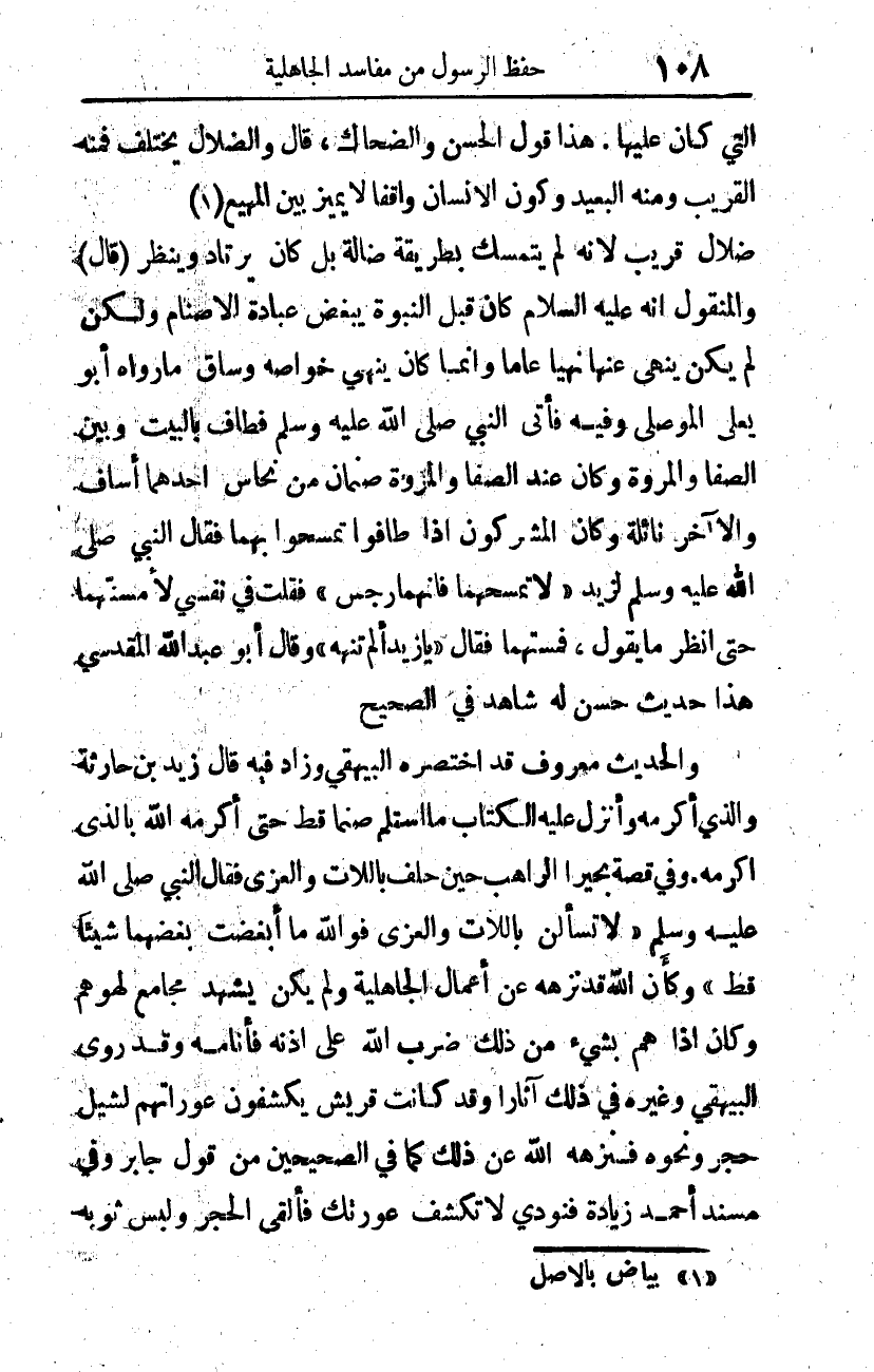 (قال): والمنقول أنه -عليه السلام- كان قبل النبوة يبغض عبادة الأصنام، ولكن لم يكن ينهى عنها نهيا عاما، وإنما كان ينهي خواصه، وساق ما رواه أبو يعلى الموصلي، وفيه: "فأتى النبي صلى الله عليه وسلم فطاف بالبيت، وبين الصفا والمروة، وكان عند الصفا والمروة صنمان من نحاس أحدهما أساف، والآخر نائلة، وكان المشركون إذا طافوا تمسحوا بهما فقال النبي صلى الله عليه وسلم لزيد: لا تمسحهما فإنهما رجس، فقلت في نفسي لأمسنهما حتى انظر ما يقول، فمسستهما فقال: يا زيد ألم تنهه؟ " وقال أبو عبد الله المقدسي: هذا حديث حسن له شاهد في الصحيح.