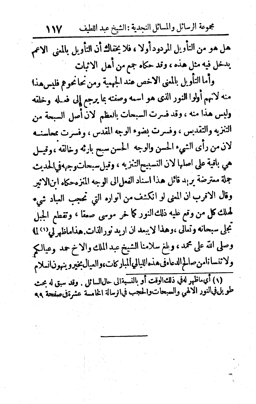 وأما التأويل بالمعنى الأخص عند الجهمية ومن نحا نحوهم، فليس هذا منه لأنهم أولوا النور الذي هو اسمه وصفته بما يرجع إلى فعله وخلقه، وليس هذا منه. وقد فسرت السبحات بالعظم لأن أصل السبحة من التنْزيه والتقديس، وفسرت بضوء الوجه المقدس، وفسرت بمحاسنه لأن من رأى الشيء الحسن، والوجه الحسن سبح بارئه وخالقه. وقيل: هي باقية على أصلها، لأن التسبيح التنْزيه. وقيل: سبحات وجهه في الحديث جملة معترضة، يريد قائل هذا إسناد الفعل إلى الوجه المنزه حكاه ابن الأثير، وقال: الأقرب أن المعنى لو انكشف من أنواره التي تحجب العباد شيء، لهلك كل من وقع عليه ذلك النور، كما خر موسى صعقا، وتقطع الجبل -تجلى سبحانه وتعالى-، وهذا لا يبعد إن أريد نور الذات، هذا ما ظهر لي 1 لما. وصلى الله على محمد، وبلغ سلامنا الشيخ عبد الملك والأخ حمد وعيالكم، ولا تنسانا من صالح الدعاء في هذه الليالي المباركات، والعيال بخير، وينهون السلام.
