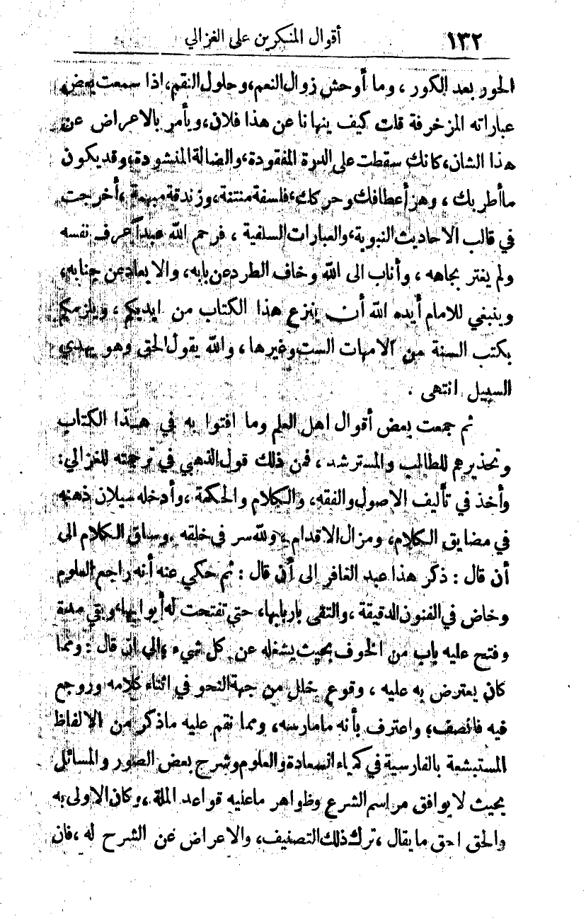الحور بعد الكور! وما أوحش زوال النعم، وحلول النقم! إذا سمعت بعض عباراته المزخرفة قلت: كيف ينهانا عن هذا فلان، ويأمر بالإعراض عن هذا الشان، كأنك سقطت على الدرة المفقودة، والضالة المنشودة. وقد يكون ما أطربك، وهز أعطافك، وحركك، فلسفة منتنة وزندقة مبهمة، أخرجت في قالب الأحاديث النبوية، والعبارات السلفية، فرحم الله عبدا عرف نفسه، ولم يغتر بجاهه، وأناب إلى الله، وخاف الطرد عن بابه، والإبعاد عن جنابه. وينبغي للإمام -أيده الله- أن ينزع هذا الكتاب من أيديكم، ويلزمكم بكتب السنة من الأمهات الست وغيرها، والله يقول الحق، وهو يهدي السبيل، انتهى.