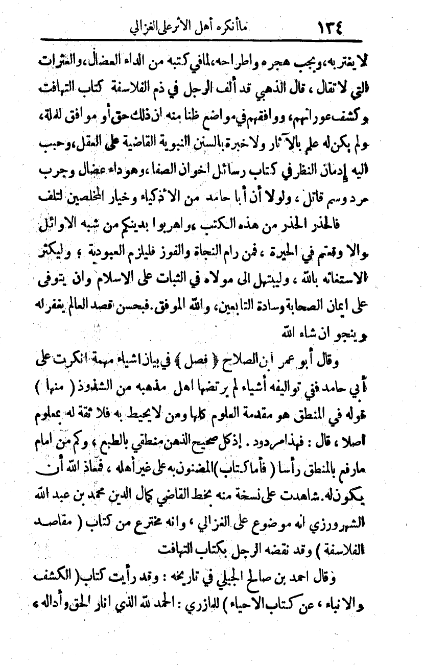 وقال أبو عمر بن الصلاح: (فصل) في بيان أشياء مهمة أنكرت على أبي حامد، ففي تواليفه أشياء لم يرضها أهل مذهبه من الشذوذ (منها) قوله في المنطق: هو مقدمة العلوم كلها، ومن لا يحيط به، فلا ثقة له بمعلوم أصلا، قال: فهذا مردود. إذ كل صحيح الذهن منطقي بالطبع، وكم من إمام ما رفع بالمنطق رأسا. (فأما كتاب) "المضنون به على غير أهله"، فمعاذ الله أن يكون له. شاهدت على نسخة منه بخط القاضي كمال الدين محمد بن عبد الله الشهرزوري أنه موضوع على الغزالي، وأنه مخترع من كتاب (مقاصد الفلاسفة)، وقد نقضه الرجل بكتاب التهافت.
