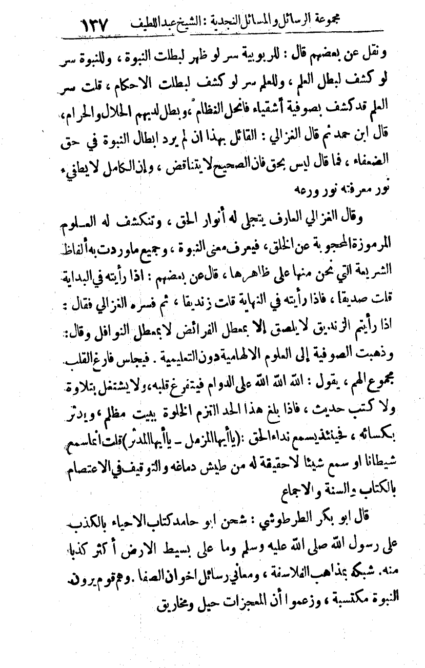 ونقل عن بعضهم قال: للربوبية سر لو ظهر لبطلت النبوة، وللنبوة سر لو كشف لبطل العلم، وللعلم سر لو كشف لبطلت الأحكام. قلت: سر العلم قد كشف بصوفية أشقياء، فانحل النظام، وبطل لديهم الحلال والحرام. قال ابن حمد: ثم قال الغزالي: القائل بهذا إن لم يرد إبطال النبوة في حق الضعفاء، فما قال ليس بحق، فإن الصحيح لا يتناقض، وإن الكامل لا يطفئ نور معرفته نور ورعه.