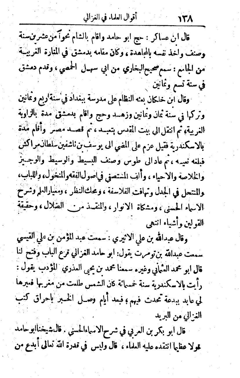 وقال ابن خلكان: بعثه النظام على مدرسة ببغداد في سنة أربع وثمانين، وتركها في سنة ثمان وثمانين، وزهد، وحج، وأقام بدمشق مدة بالزاوية الغربية، ثم انتقل إلى بيت المقدس يتعبد، ثم قصد مصر، وأقام مدة بالإسكندرية، فقيل عزم على المضي إلى يوسف بن تاشفين سلطان مراكش فبلغه نعيه. ثم عاد إلى طوس، وصنف البسيط، والوسيط، والوجيز، والخلاصة، والإحياء، وألف المستصفى في أصول الفقه، والمنخول، واللباب، المنتحل في الجدل، وتهافت الفلاسفة، ومحك النظر، ومعيار العلم، وشرح الأسماء الحسنى، ومشكاة الأنوار، والمنقذ من الضلال، وحقيقة القولين، وأشياء، انتهى.