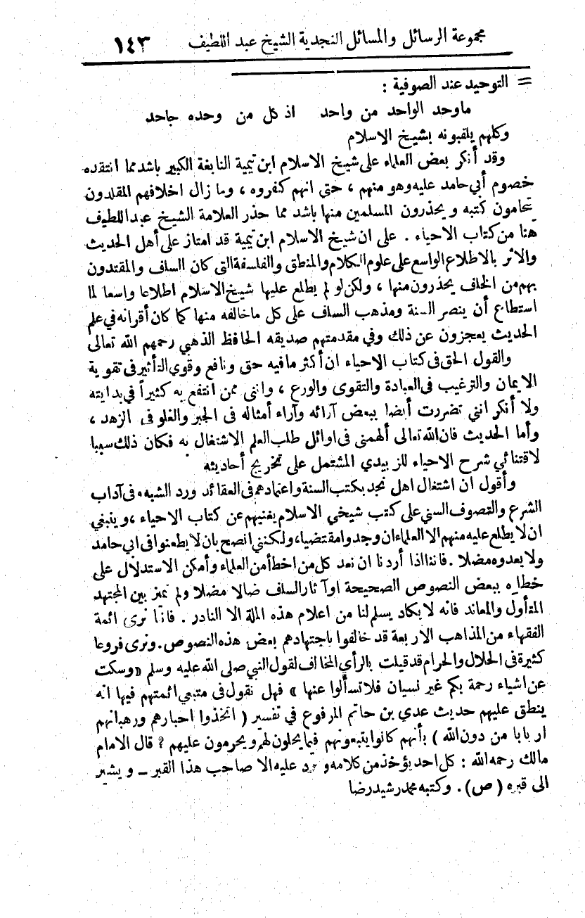 وقد أنكر بعض العلماء على شيخ الإسلام ابن تيمية النابغة الكبير بأشد مما انتقده خصوم أبي حامد عليه، وهو منهم، حتى إنهم كفروه، وما زال أخلافهم المقلدون يتحامون كتبه، ويحذرون المسلمين منها بأشد مما حذر العلامة الشيخ عبد اللطيف هنا من كتاب الإحياء. على أن شيخ الإسلام ابن تيمية قد امتاز على أهل الحديث والأثر بالإطلاع الواسع على علوم الكلام والمنطق والفلسفة التي كان السلف والمقتدون بهم من الخلف يحذرون منها، ولكن لو لم يطلع عليها شيخ الإسلام إطلاعا واسعا لما استطاع أن ينصر السنة ومذهب السلف على كل ما خالفه منها، كما كان أقرانه في علم الحديث يعجزون عن ذلك، وفي مقدمتهم صديقه الحافظ الذهبي رحمهم الله -تعالى-.