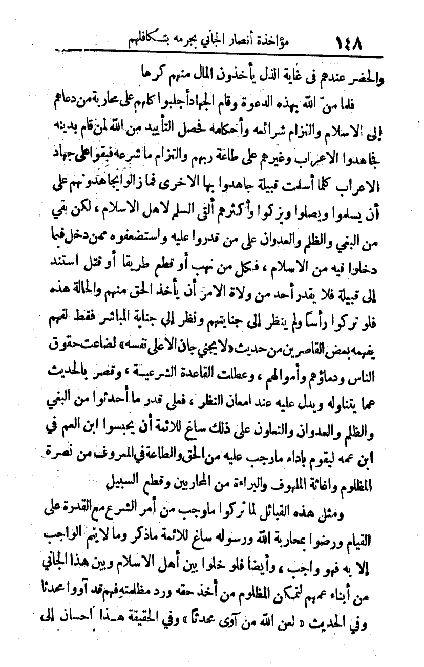 فلما مَنَّ الله بهذه الدعوة، وقام الجهاد، أجلبوا كلهم على محاربة من دعاهم إلى الإسلام والتزام شرائعه وأحكامه، فحصل التأييد من الله لمن قام بدينه، فجاهدوا الأعراب وغيرهم على طاعة ربهم، والتزام ما شرعه، فبقوا على جهاد الأعراب كلما أسلمت قبيلة جاهدوا بها الأخرى، فما زالوا يجاهدونهم على أن يسلموا، ويصلوا ويزكوا. وأكثرهم ألقى السلم لأهل الإسلام، لكن بقي من البغي والظلم والعدوان على من قدروا عليه واستضعفوه ممن دخل فيما دخلوا فيه من الإسلام، فكل من نهب أو قطع طريقا أو قتل استند إلى قبيلة، فلا يقدر أحد من ولاة الأمر أن يأخذ الحق منهم. والحالة هذه فلو تركوا رأسا، ولم ينظر إلى جنايتهم، ونظر إلى جناية المباشر فقط، لفهم يفهمه بعض القاصرين من حديث "لا يجني جان إلا على نفسه" لضاعت حقوق الناس، ودماؤهم، وأموالهم، وعطلت القاعدة الشرعية، وقصر بالحديث عما يتناوله، ويدل عليه عند إمعان النظر، فعلى قدر ما أحدثوا من البغي، والظلم والعدوان والتعاون على ذلك، ساغ للأئمة أن يحبسوا ابن العم في ابن عمه ليقوم بأداء ما وجب عليه من الحق والطاعة في المعروف من نصرة المظلوم، وإغاثة الملهوف، والبراءة من المحاربين وقطع السبيل.