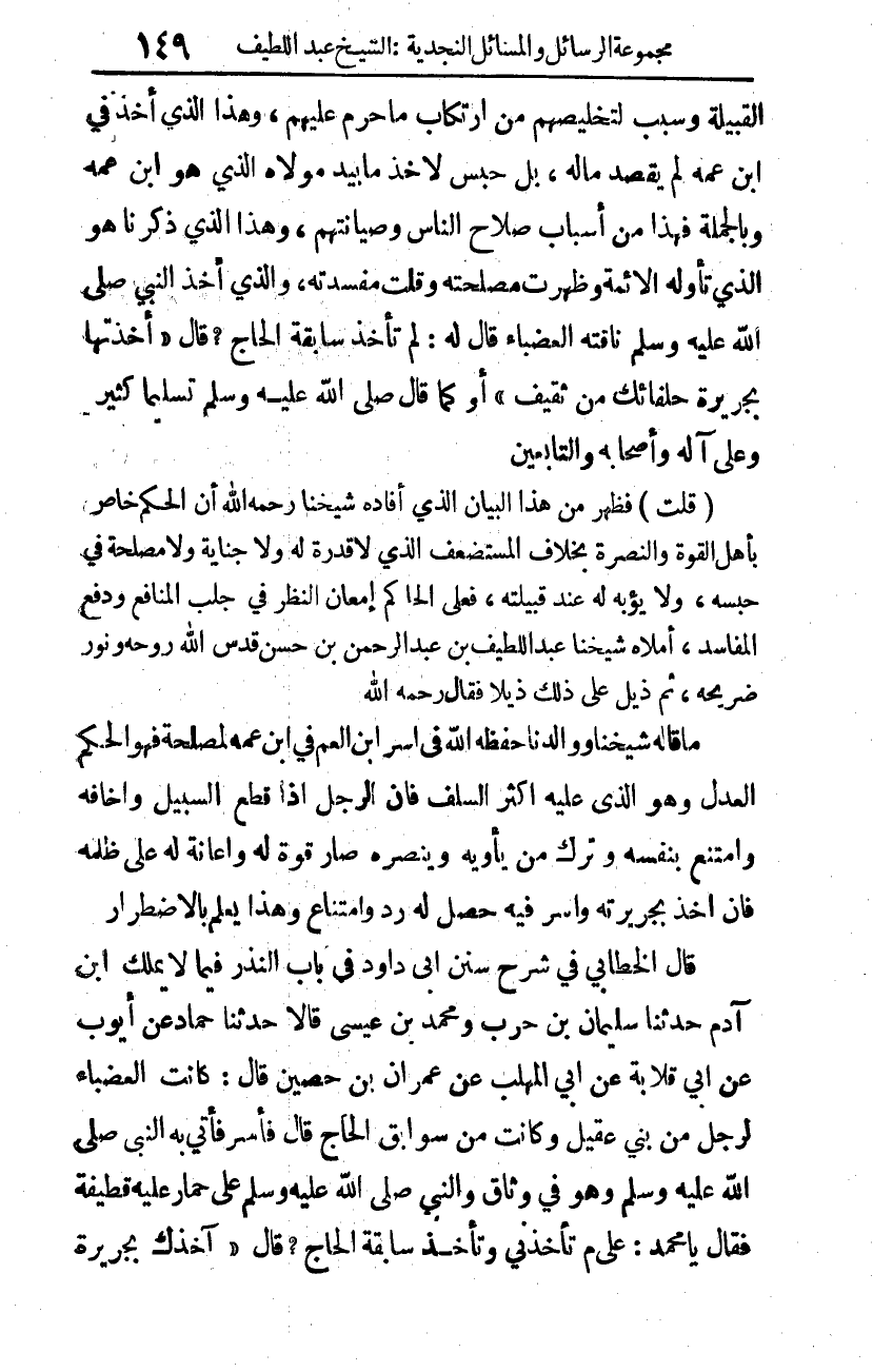 (قلت): فظهر من هذا البيان الذي أفاده شيخنا -رحمه الله- أن الحكم خاص بأهل القوة والنصرة بخلاف المستضعف الذي لا قدرة له، ولا جناية ولا مصلحة في حبسه ولا يؤبه له عند قبيلته، فعلى الحاكم إمعان النظر في جلب المنافع ودفع المفاسد، أملاه شيخنا عبد اللطيف بن عبد الرحمن بن حسن -قدس الله روحه، ونور ضريحه-، ثم ذيل على ذلك ذيلا فقال -رحمه الله-: