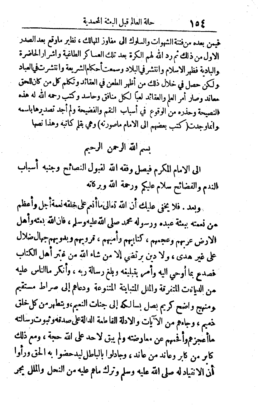 فيمن بعده من فتنة الشهوات والسلوك إلى مَفَاوِز المهالك نظير ما وقع بعد الصدر الأول من ذلك، ثم رد الله لهم الكَرَّة بعد تلك العساكر الطاغية وأشرار الحاضرة والبادية، فظهر الإسلام، وانتشر في البلاد، وسمعت أحكام الشريعة، وانتشرت في العباد. ولكن حصل في خلال ذلك مَنْ أظهر الطعن في العقائد، وتكلم كل مَن كان للحق معاند، وصار أمر العلم والعقائد لَعِبًا لكل منافق وحاسد. وكتب -رحمه الله- له هذه النصيحة، وحذره من الوقوع في أسباب النقم والفضيحة، ولم أجد تصديرها باسمه، وإنما وجدت (كتب بعضهم إلى الإمام ما صورته) وهي بقلم كاتبه وهذا نصها: