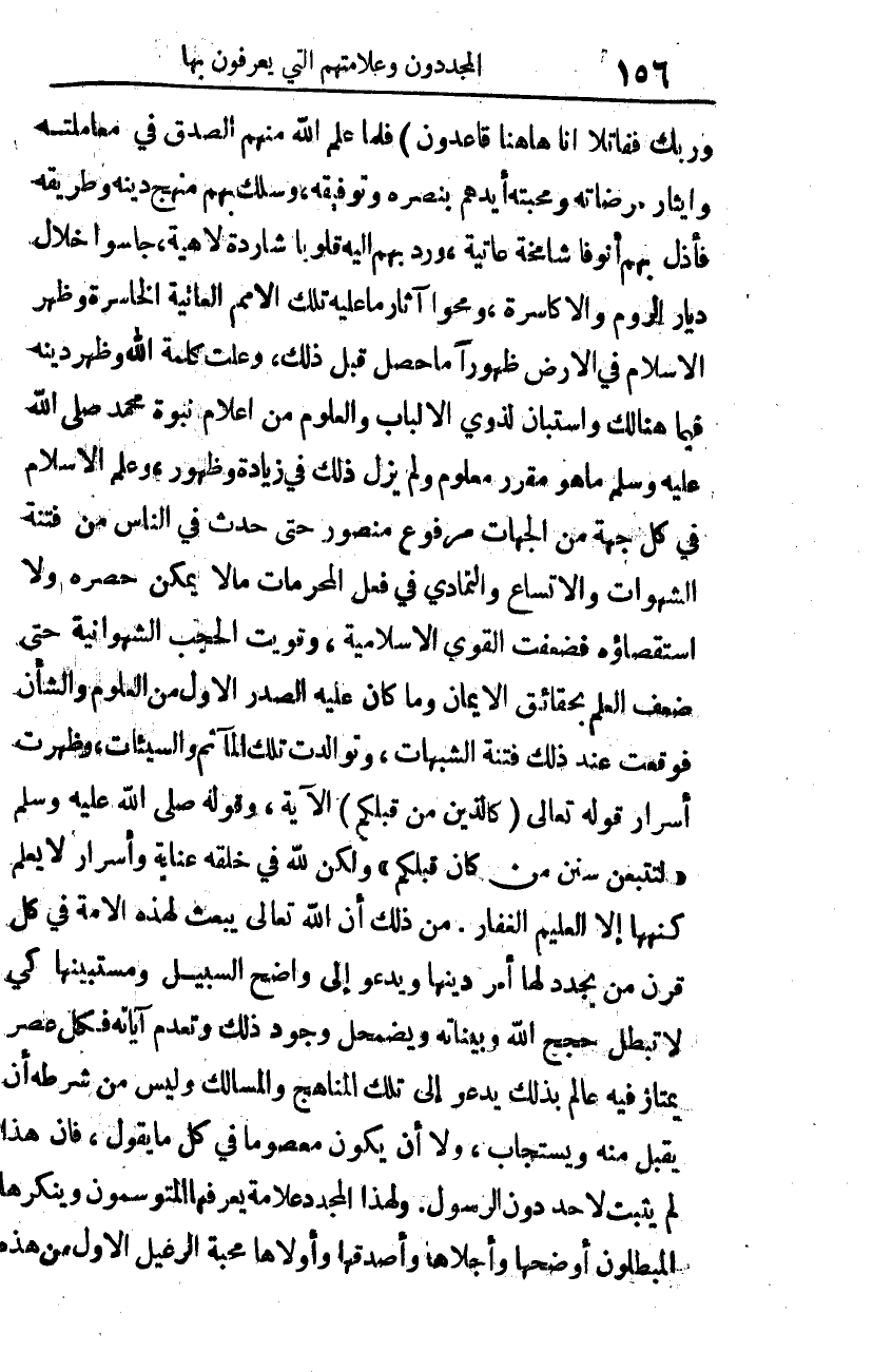 من ذلك: أن الله -تعالى- يبعث لهذه الأمة في كل قرن من يجدد لها أمر دينها، ويدعو إلى واضح السبيل ومستبينها؛ كي لا تبطل حجج الله وبيناته؛ ويضمحل وجود ذلك وتعدم آياته؛ فكل عصر يمتاز فيه عالم بذلك يدعو إلى تلك المناهج والمسالك. وليس من شرطه: أن يُقْبَل منه ويُسْتَجَاب، ولا أن يكون معصوما في كل ما يقول، فإن هذا لم يثبت لأحد دون الرسول. ولهذا المُجَدِّد علامةٌ يعرفها المُتَوَسِّمُونَ، وينكرها المبطلون؛ أوضحها وأجلاها، وأصدقها، وأولاها: محبة الرعيل الأول من هذه