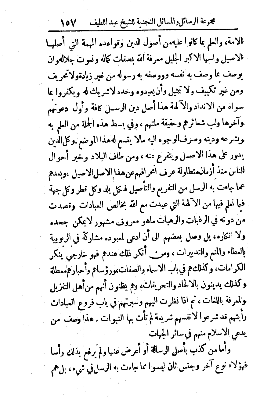الأمة، والعلم بما كانوا عليه من أصول الدين، وقواعده المهمة التي أصلها الأصيل، وَأُسُّهَا الأكبرُ الجليل: معرفة الله بصفات كماله ونعوت جلاله، وأن يوصف بما وصف به نفسه ووصفه به رسوله من غير زيادة ولا تحريف، ومن غير تكييف ولا تمثيل، وأن يعبدوه وحده لا شريك له، ويكفروا بما سواه من الأنداد والآلهة، هذا أصل دين الرسل كافة، وأول دعوتهم وآخرها، وَلُبُّ شعائرهم، وحقيقةُ مِلَّتِهِمْ. وفي بسط هذه الجملة من العلم به وبشرعه ودينه وصرف الوجوه إليه ما لا يتسع له هذا الموضع. وكل الدين يدور على هذا الأصل ويتفرع عنه. ومن طاف البلاد، وخَبرَ أحوال الناس منذ أزمان متطاولة عرف انحرافهم عن هذا الأصل الأصيل، وبُعْدَهُم عما جاءت به الرسل من التفريع والتأصيل. فكل بلد وكل قطر وكل جهة -فيما نعلم- فيها من الآلهة التي عُبِدَتْ مع الله بخالص العبادات وَقُصِدَتْ من دونه في الرغبات والرهبات ما هو معروف مشهور لا يمكن جحده ولا إنكاره، بل وصل بعضهم إلى أن ادعى لمعبوده مشاركة في الربوبية بالعطاء والمنع والتدبيرات، ومن أنكر ذلك عندهم فهو خَارِجِيٌّ ينكر الكرامات، وكذلك هم في باب الأسماء والصفات، ورؤساؤهم وأحبارهم مُعَطِّلة. وكذلك يدينون بالإلحاد والتحريفات، وهم يظنون أنهم من أهل التنزيل والمعرفة باللغات، ثم إذا نظرت إليهم وَسَبَرْتَهُمْ في باب فروع العبادات، رأيتهم قد شرعوا لأنفسهم شريعة لم تأت بها النبوات، هذا وصف من يدعي الإسلام منهم في سائر الجهات.