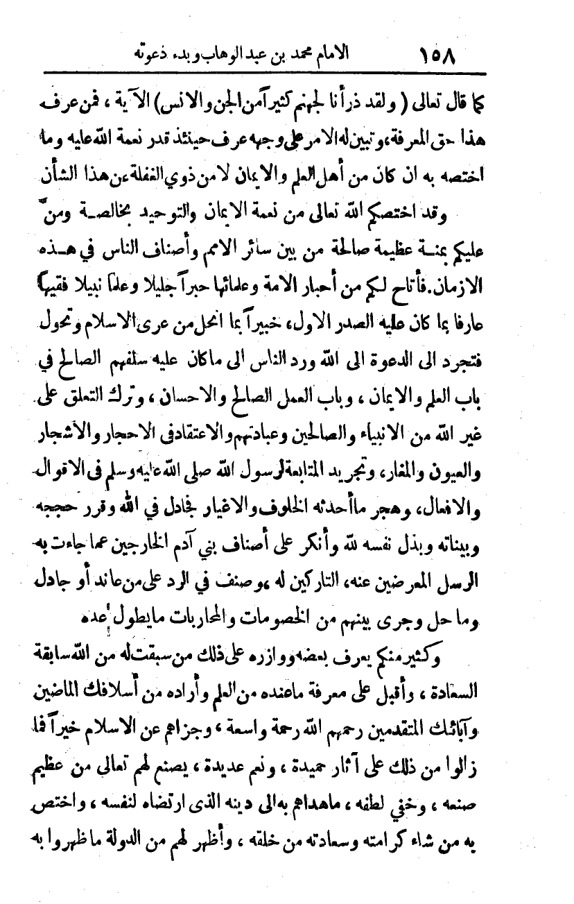 وقد اختصكم الله - تعالى- من نعمة الإيمان والتوحيد بِخَالِصَةٍ، ومنَّ عليكم بمِنَّةٍ عظيمة صالحة من بين سائر الأمم وأصناف الناس في هذه الأزمان؛ فأتاح لكم من أحبار الأمة وعلمائها حَبْرًا جليلا وعَلَمًا نبيلا فقيها عارفًا بما كان عليه الصدر الأول، خبيرا بما انْحَلَّ من عُرَى الإسلام وتحول. فتجرد إلى الدعوة إلى الله، وردِّ الناس إلى ما كان عليه سلفُهم الصالح في باب العلم والإيمان، وباب العمل الصالح والإحسان، وترك التعلق على غير الله من الأنبياء والصالحين وعبادتهم، والاعتقاد في الأحجار والأشجار والعيون والمَغَار، وتجريد المتابعة لرسول الله -صلى الله عليه وسلم- في الأقوال والأفعال. وهجر ما أحدثه الخلوف والأغيار، فجادل في الله، وقَرَّرَ حُجَجَه وبيناته، وبذل نفسه لله، وأنكر على أصناف بني آدم الخارجين عما جاءت به الرسل المعرضين عنه، التاركين له. وصنَّفَ في الرد على مَن عاند أو جادل ومَاحَلَ، وجرى بينهم من الخصومات والمحاربات ما يطول عدُّهُ.