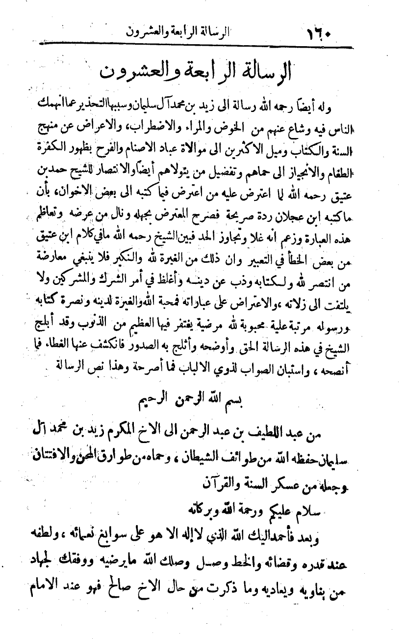 من عبد اللطيف بن عبد الرحمن إلى الأخ المكرم زيد بن محمد آل سليمان -حفظه الله من طوائف الشيطان، وحماه من طوارق المحن والافتتان، وجعله من عسكر السنة والقرآن-.