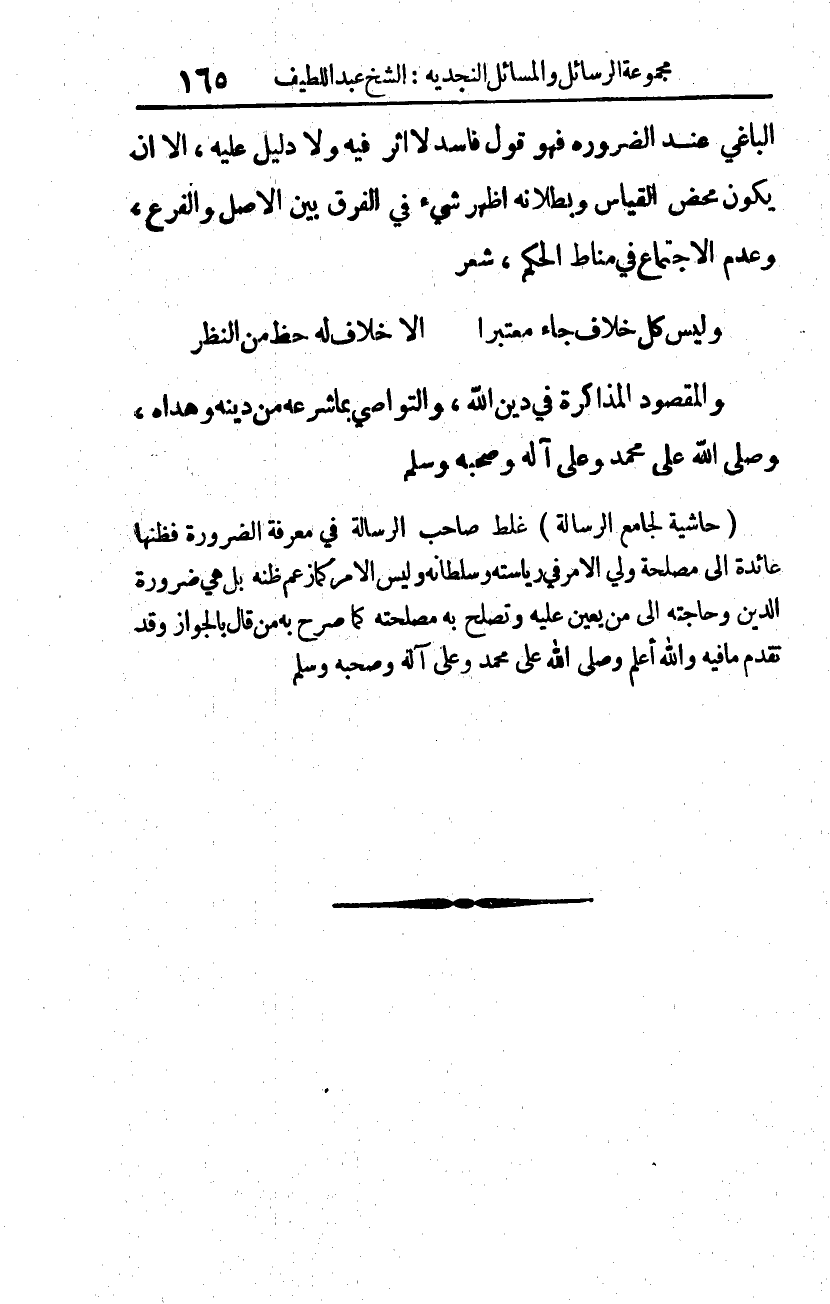 (حاشية لجامع الرسالة) غلط صاحب الرسالة في معرفة الضرورة، فظنها عائدة إلى مصلحة ولي الأمر في رياسته وسلطانه، وليس الأمر كما زعم ظنه؛ بل هي ضرورة الدين وحاجته إلى مَنْ يعين عليه؛ وتصلح به مصلحته؛ كما صرح به من قال بالجواز؛ وقد تقدم ما فيه، والله أعلم، وصلى الله على محمد وعلى آله وصحبه وسلم.