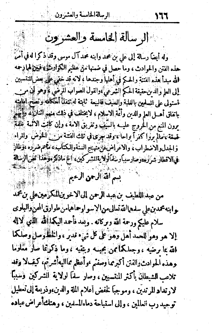 من عبد اللطيف بن عبد الرحمن إلى الأخوين المكرمين علي بن محمد وابنه محمد بن علي -سلمهما الله تعالى من الأسوا، وحماهما من طوارق المحن والبلوى-.