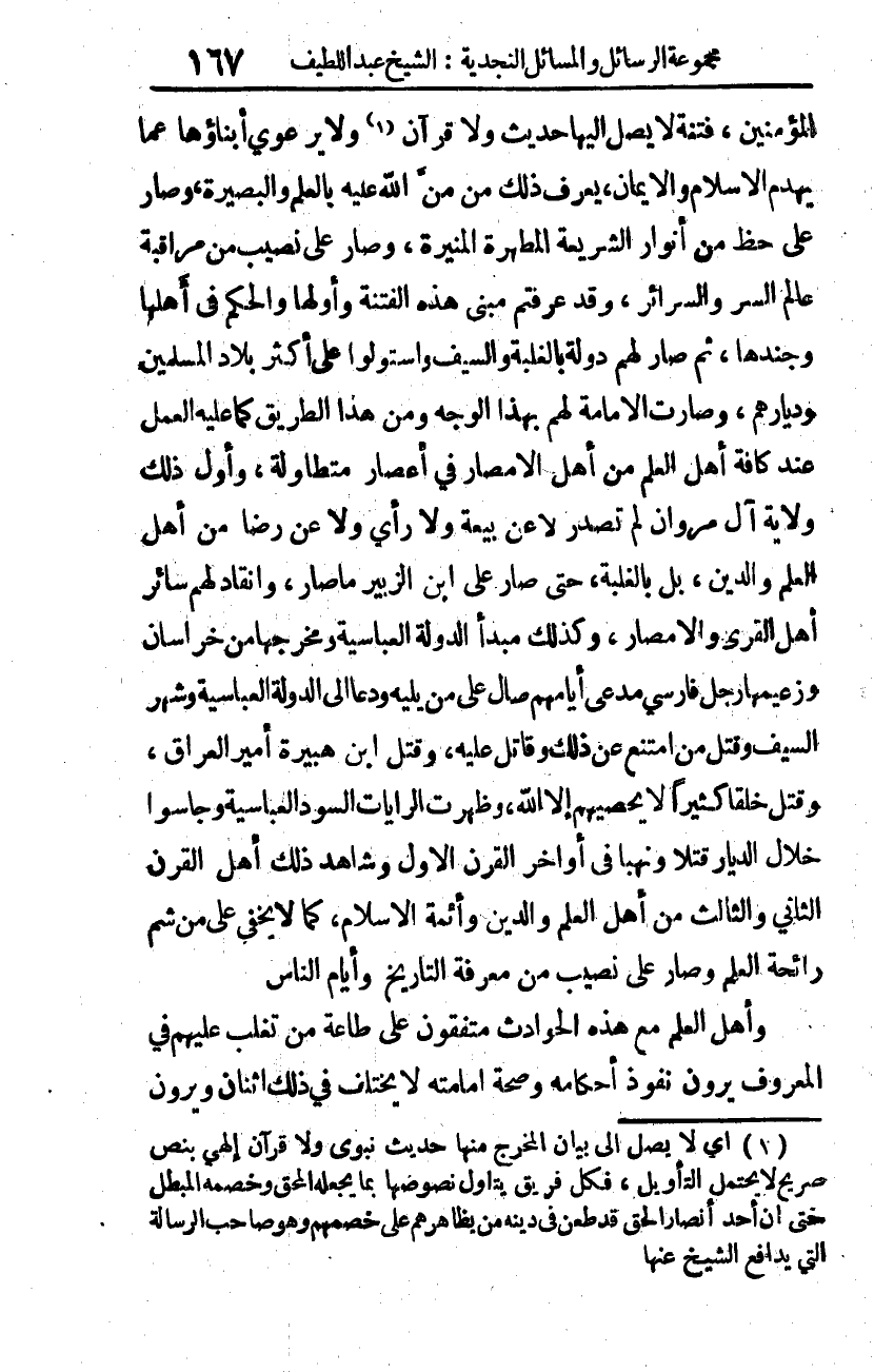 المؤمنين، فتنة لا يصل إليها حديث ولا قرآن 1، ولا يرعوي أبناؤها عما يهدم الإسلام والإيمان؛ يعرف ذلك مَنْ منَّ الله عليه بالعلم والبصيرة، وصار على حظ من أنوار الشريعة المطهرة المنيرة، وصار على نصيب من مراقبة عالم السر والسرائر. وقد عرفتم مبنى هذه الفتنة وأولها والحكم في أهلها وجندها، ثم صار لهم دولة بالغلبة والسيف، واستولوا على أكثر بلاد المسلمين وديارهم، وصارت الإمامة لهم بهذا الوجه، ومن هذا الطريق كما عليه العمل عند كافة أهل العلم من أهل الأمصار في أعصار متطاولة. وأول ذلك ولاية آل مروان لم تصدر لا عن بيعة، ولا رأي، ولا عن رضى من أهل العلم والدين، بل بالغلبة، حتى صار على ابن الزبير ما صار، وانقاد لهم سائر أهل القرى والأمصار. وكذلك مبدأ الدولة العباسية ومخرجها من خراسان وزعيمها رجل فارسي مُدَّعِي؛ أيامهم صَالَ على مَن يَلِيهِ ودعا إلى الدولة العباسية وشَهَرَ السيف، وقتل مَن امتنع عن ذلك وقاتل عليه، وقتل ابن هبيرة أمير العراق، وقتل خلقا كثيرا لا يحصيهم إلا الله؛ وظهرت الرايات السود العباسية وجاسوا خلال الديار قتلا ونهبا في أواخر القرن الأول. وشاهد ذلك أهل القرن الثاني والثالث من أهل العلم والدين وأئمة الإسلام، كما لا يخفى على من شم رائحة العلم، وصار على نصيب من معرفة التاريخ وأيام الناس.