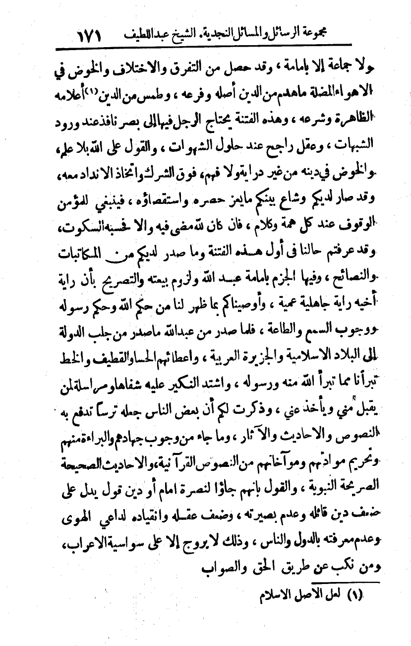 ولا جماعة إلا بإمامة، وقد حصل من التفرق والاختلاف والخوض في الأهواء المُضِلَّة ما هدم من الدين أصله وفرعه، وطمس من الدين 1 أعلامه الظاهرة وشرعه. وهذه الفتنة يحتاج الرجل فيها إلى بصر نافذ عند ورود الشبهات، وعقل راجح عند حلول الشهوات، والقول على الله بلا علم، والخوض في دينه من غير دراية ولا فهم، فوق الشرك واتخاذ الأنداد معه. وقد صار لديكم وشاع بينكم ما يعز حصرُهُ واستقصاؤه، فينبغي للمؤمن الوقوف عند كل همة وكلام، فإن كان لله مضى فيه، وإلا فَحَسْبُهُ السكوتُ، وقد عرفتم حالنا في أول هذه الفتنة، وما صدر لديكم من المكاتبات والنصائح، وفيها الجزم بإمامة عبد الله ولزوم بيعته، والتصريح بأن راية أخيه راية جاهلية عمية، وأوصيناكم بما ظهر لنا من حكم الله وحكم رسوله ووجوب السمع والطاعة. فلما صدر من عبد الله ما صدر من جلب الدولة إلى البلاد الإسلامية والجزيرة العربية، وإعطائهم الحسا والقطيف والخط، تبرأنا مما تبرأ الله منه ورسوله، واشتد النكير عليه شِفَاهًا ومراسلة لمن يقبل مني ويأخذ عني، وذكرت لكم أن بعض الناس جعله تُرْسًا تُدْفَع به النصوص والأحاديث والآثار، وما جاء من وجوب جهادهم والبراءة منهم وتحريم موادتهم وموآخاتهم من النصوص القرآنية، والأحاديث الصحيحة الصريحة النبوية. والقول بأنهم جاؤوا لنصرة إمام أو دين قول يدل على ضعف دين قائله، وعدم بصيرته، وضعف عقله وانقياده لداعي الهوى، وعدم معرفته بالدول والناس، وذلك لا يروج إلا على سواسية الأعراب، ومن نَكَبَ عن طريق الحق والصواب.